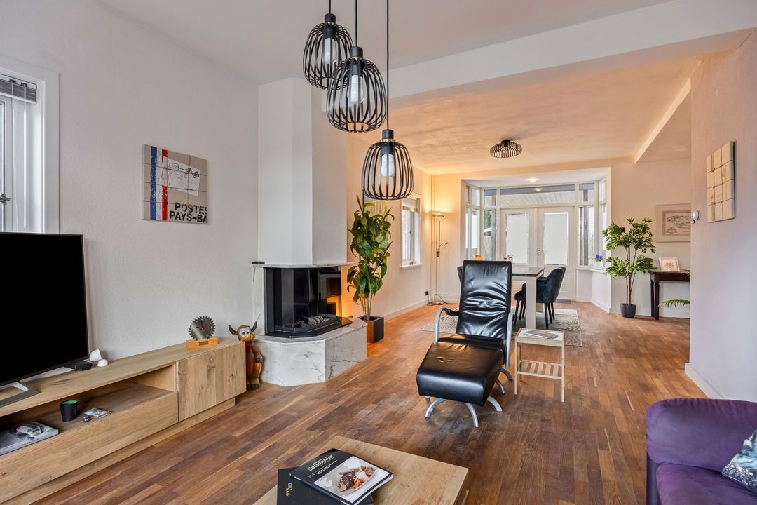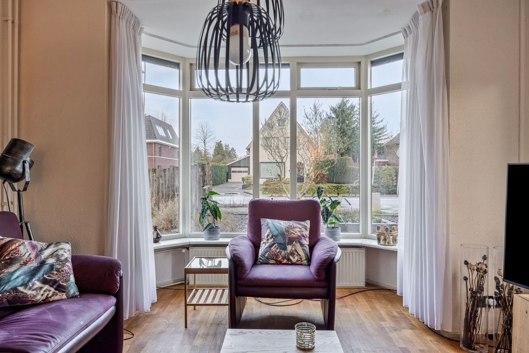De ruime lichte woonkamer geniet door de grote erker aan de voorzijde en diverse raampartijen van veel natuurlijk lichtinval. In het midden is een gashaard geplaatst voor extra warmte en sfeer. Er ligt een houtenvloer, wanden en plafond zijn in een lichte kleurstelling uitgevoerd. aan de achterzijde heeft u via openslaande tuindeuren toegang naar de tuin.