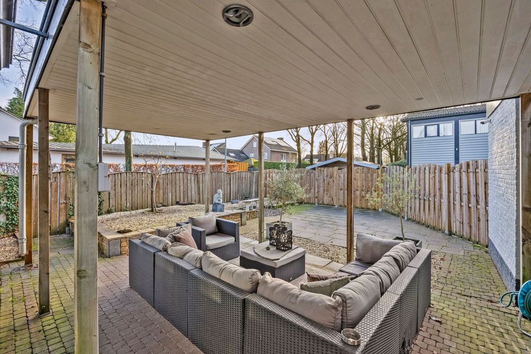 Daarnaast beschikt u over een aparte toegang naar een houten tuinhuis, gelegen naast de oprit. Dit biedt mogelijkheden voor het stallen van fietsen, tuingereedschap of extra opslag.
