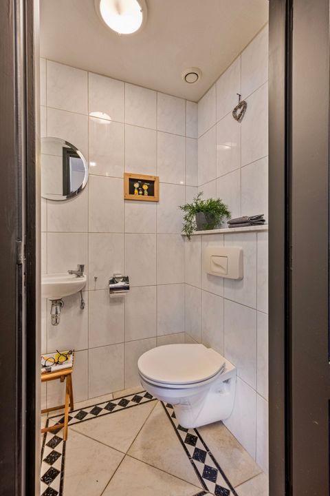 From the hallway, you can access the guest toilet with a washbasin, the meter cupboard, the staircase to the first floor, and the door to the living room.