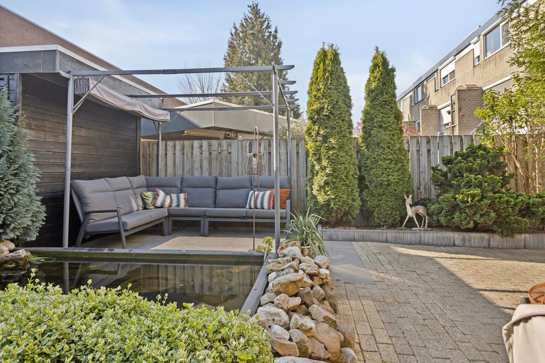 De achtertuin is een groene oase met volwassen beplanting, vijver en een ruime overkapping. De tuin heeft geen inkijk van achterburen, waardoor je geniet van optimale privacy. Een buitentrap verbindt de tuin met de keuken op de eerste verdieping. Onder het trapportaal bevindt zich een houten berging.