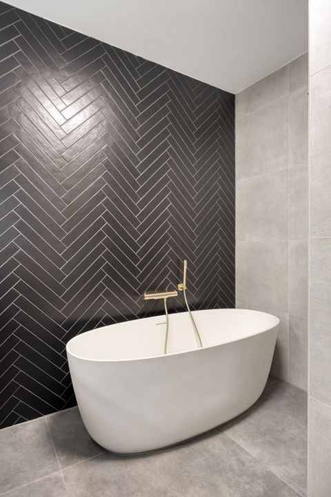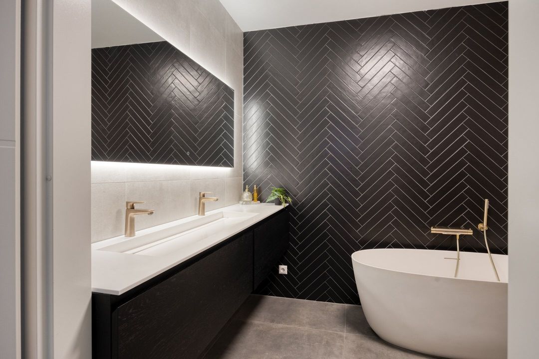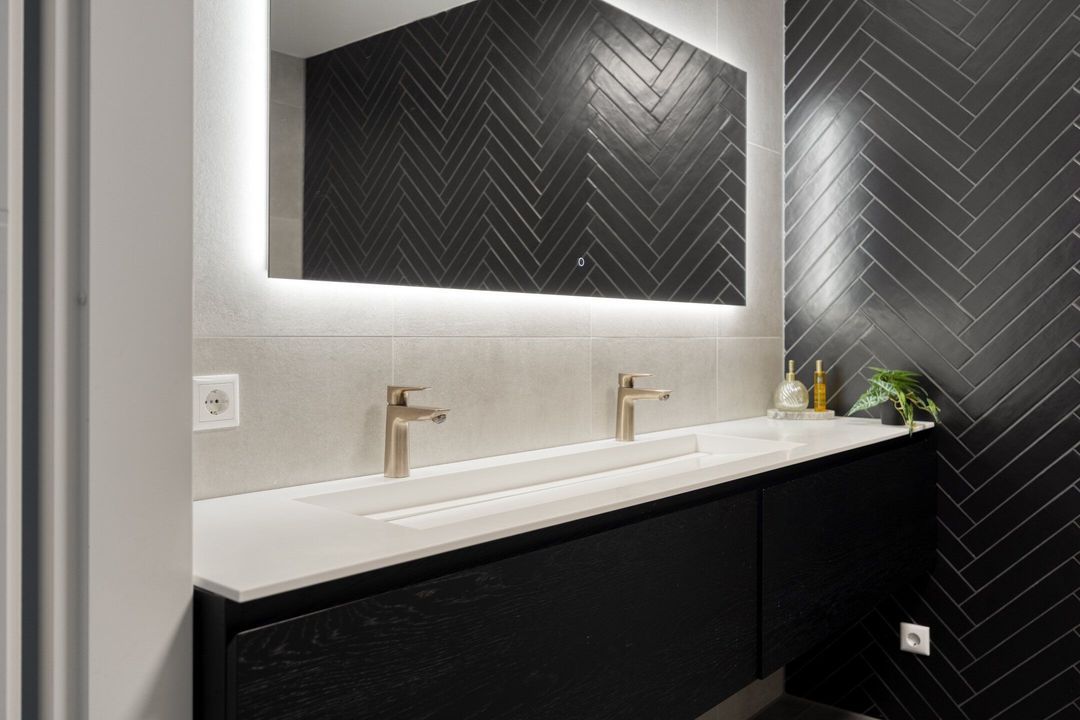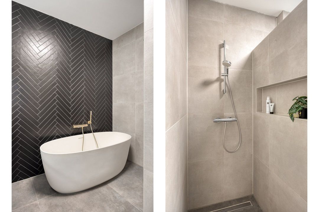 De badkamer is een oase van luxe: volledig betegeld en voorzien van een extra brede wastafel met dubbele mengkraan en onderkasten, een vrijstaand ligbad en een inloopdouche.