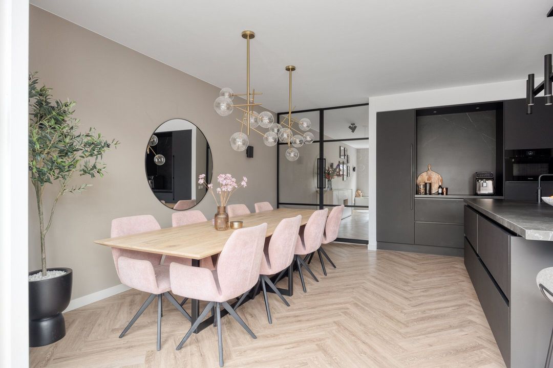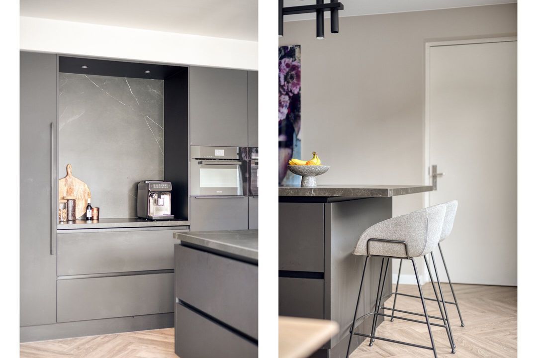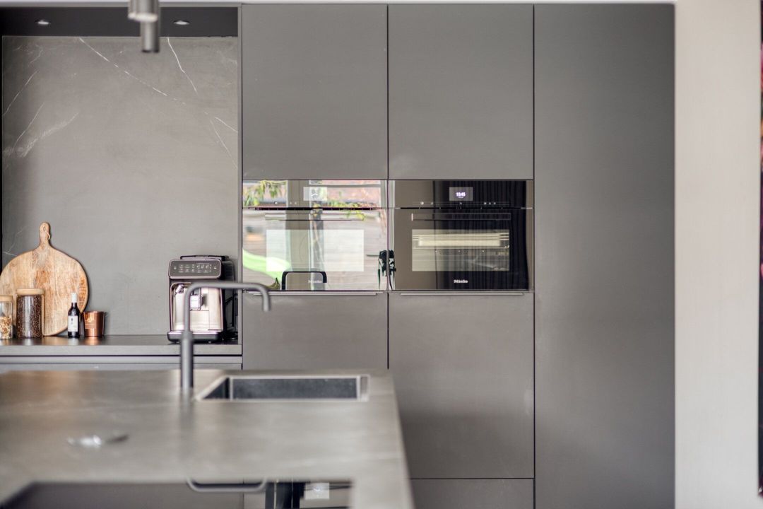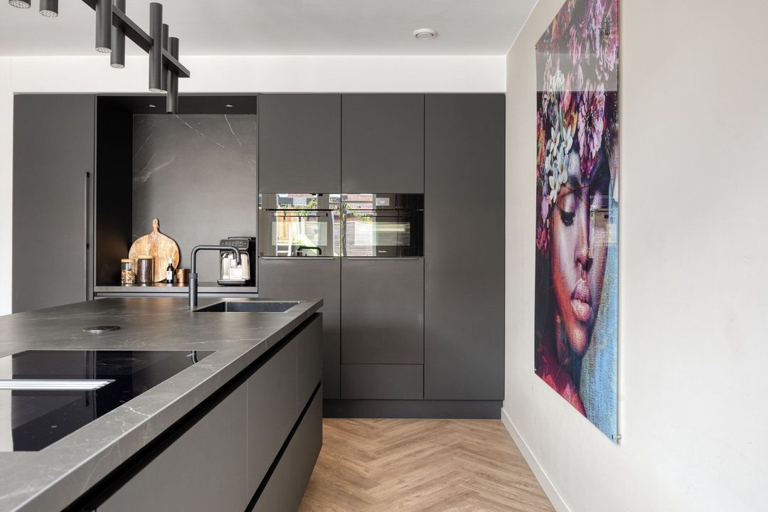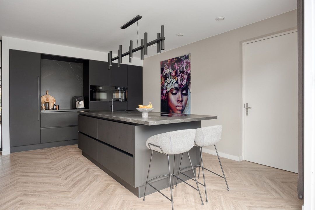 De keuken is een echte blikvanger: luxe uitgevoerd en rijk aan natuurlijke lichtinval. Het kookeiland vormt het hart van de ruimte en is uitgerust met een RVS-spoelbak met Quooker, grote koelkast, vaatwasser op hoogte, combi-oven/magnetron, stoomoven, vriezer, koffiecorner en barretje. Dankzij de inbouwspots, designverlichting en de extra stroompunten in het werkblad is dit een keuken waar design en functionaliteit samenkomen.