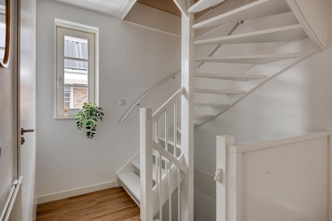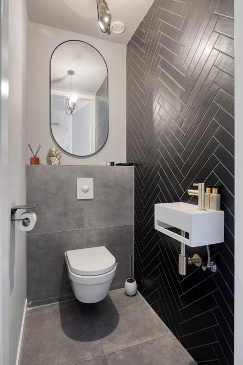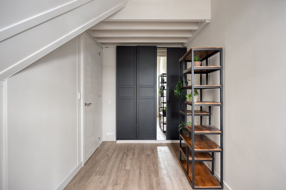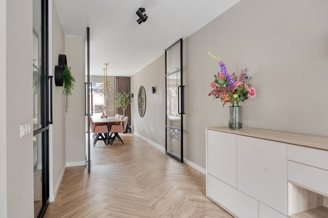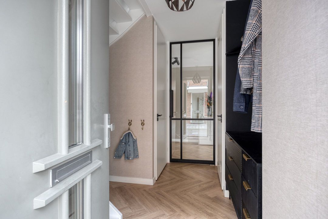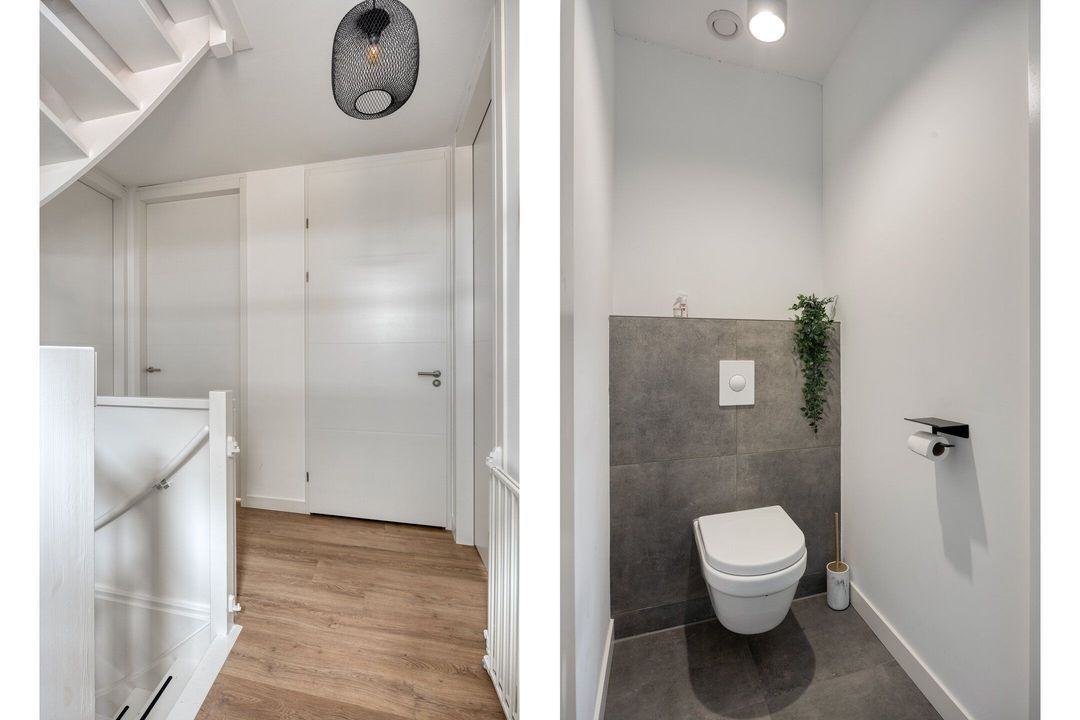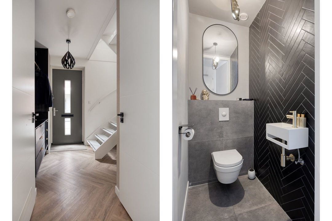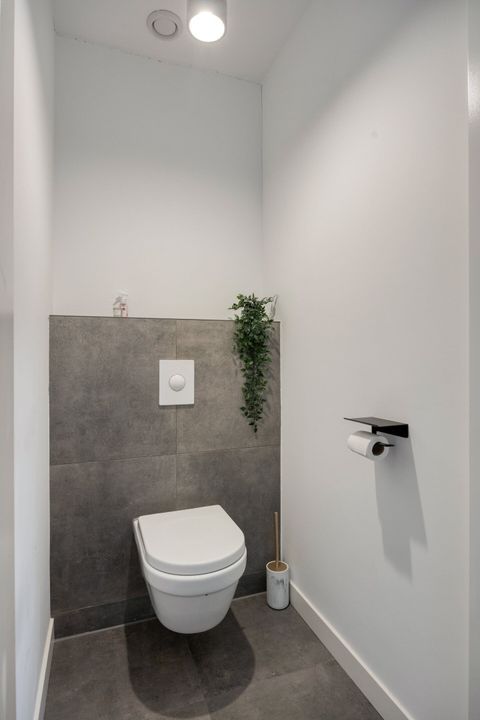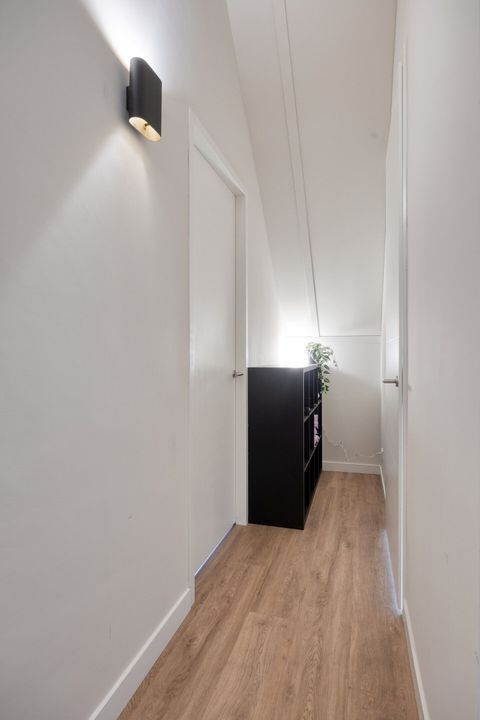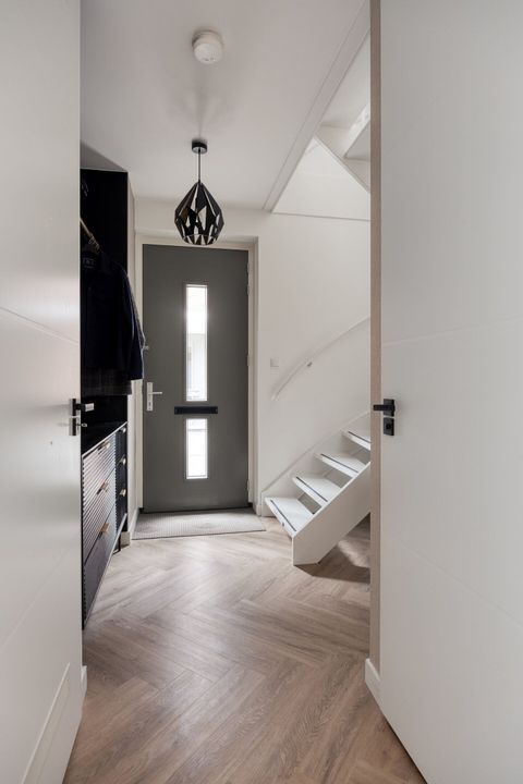 De hal biedt toegang tot het moderne gastentoilet met fonteintje, de garderobe en de meterkast. Een stijlvolle stalen taatsdeur leidt naar de woonkamer. De gehele begane grond is afgewerkt met een PVC-vloer voorzien van vloerverwarming, en de wanden en plafonds zijn strak gestuukt voor een moderne, luxe uitstraling.