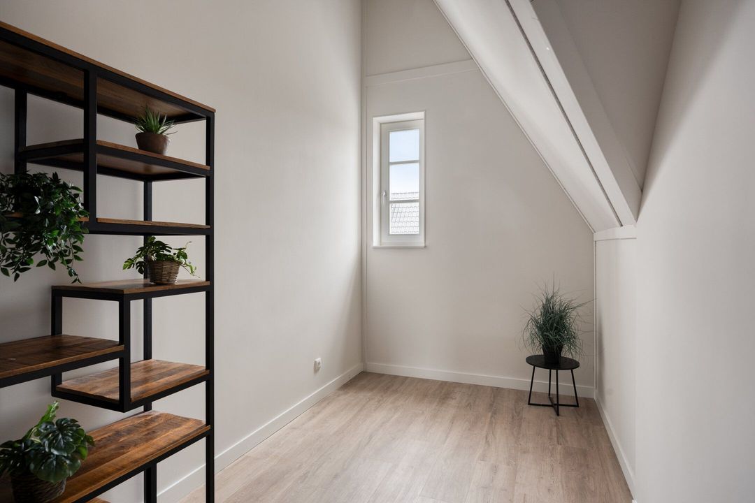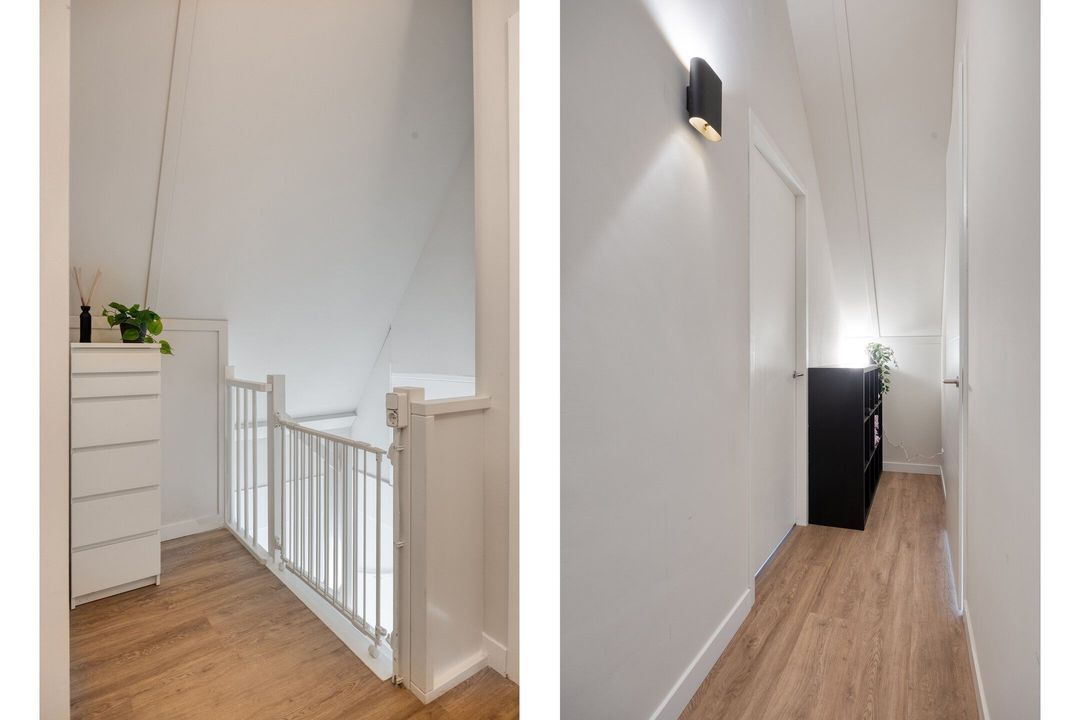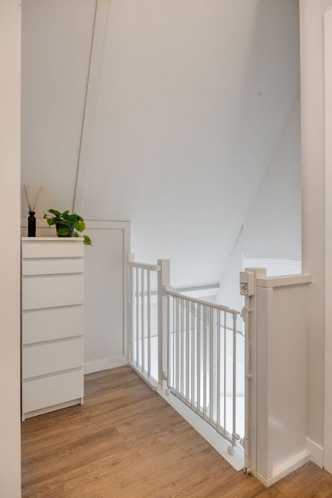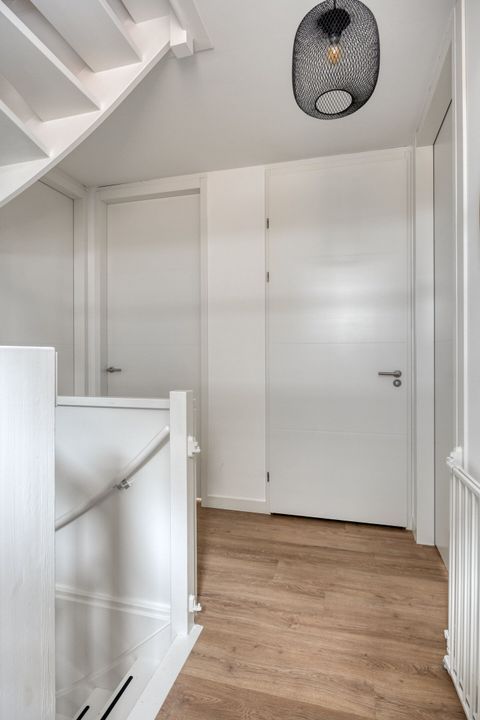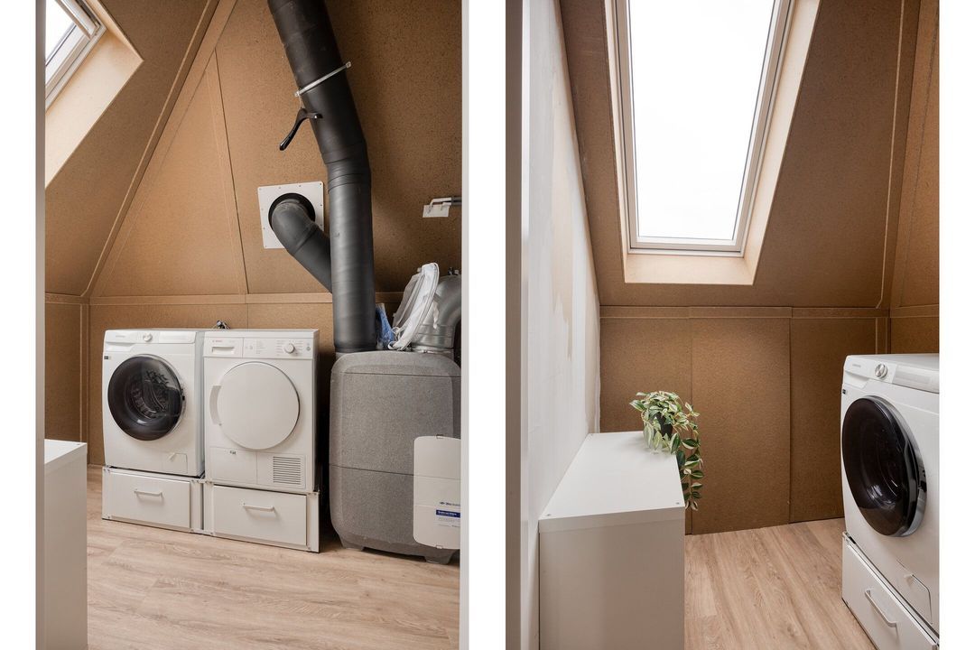 Via een vaste trap bereikt u de tweede verdieping. De overloop biedt toegang tot twee slaapkamers en een technische ruimte met witgoedaansluitingen, WTW-unit, warmtepomp, boilervat en omvormer voor de zonnepanelen.