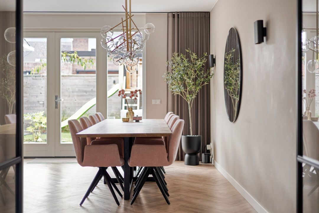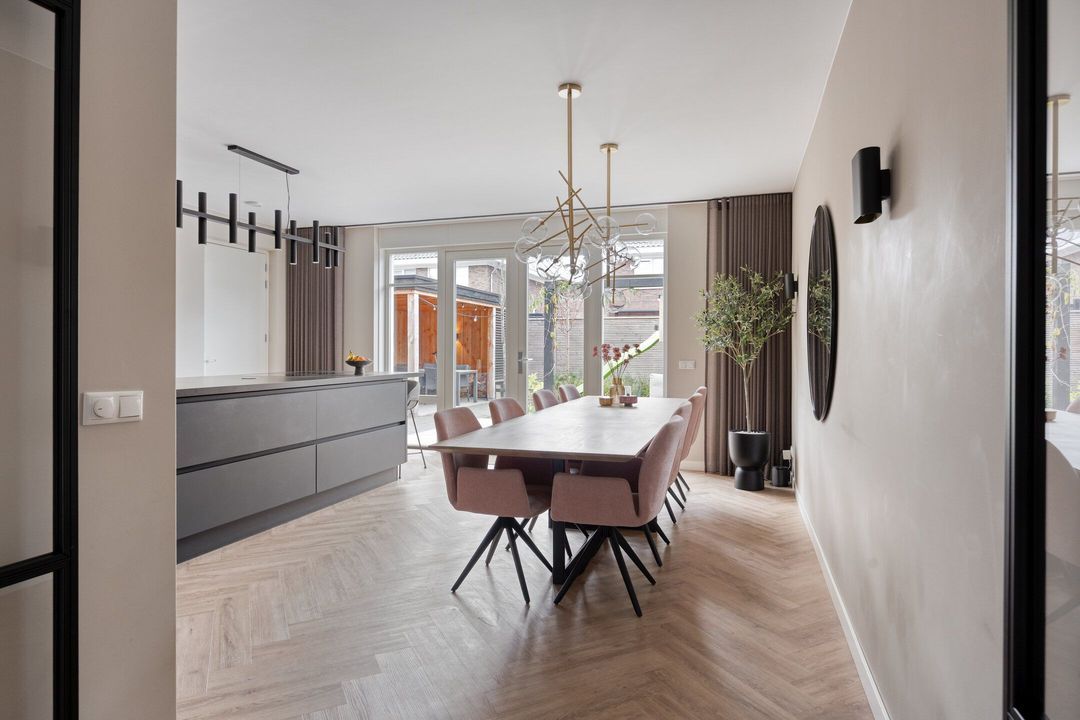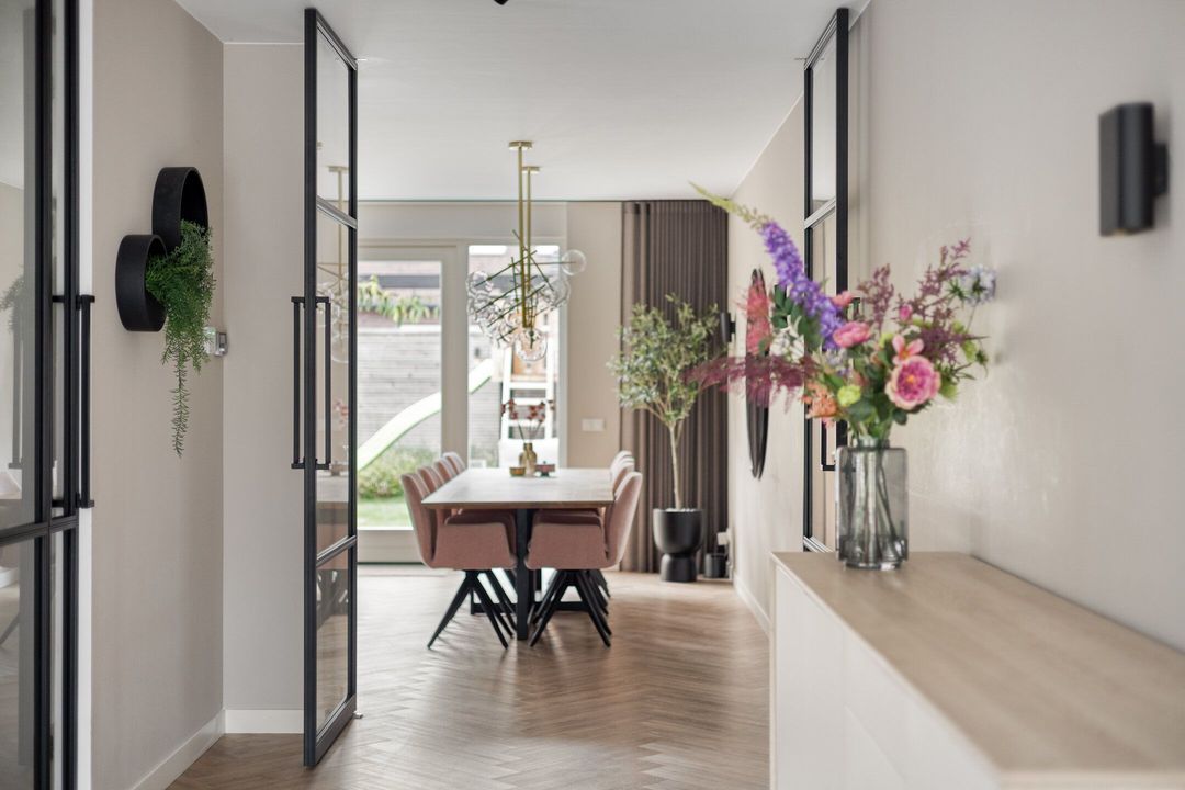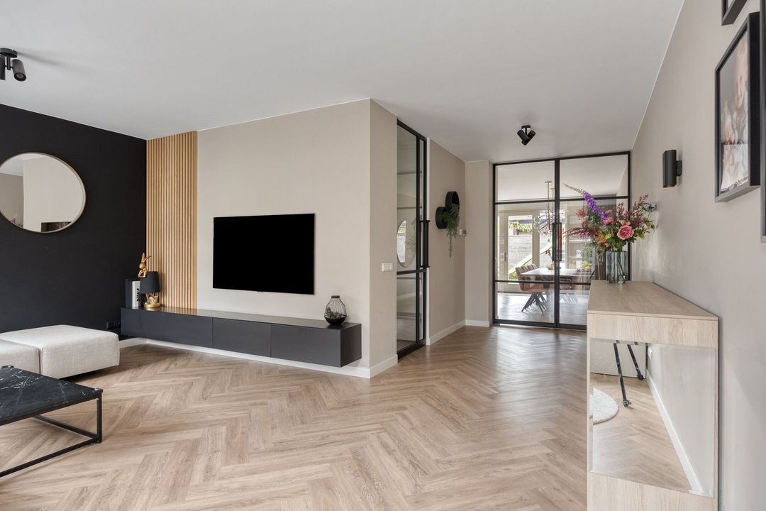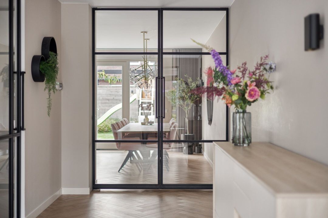 De woonkamer ligt aan de voorzijde en is bijzonder ruim en licht dankzij de grote raampartijen. De afwerking is hoogwaardig, met strakke lijnen en een rustige kleurenstelling. Via stalen openslaande taatsdeuren bereikt u de royale woonkeuken aan de achterzijde.