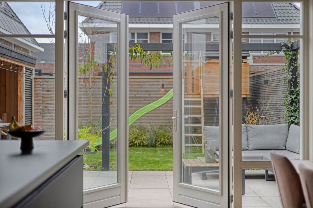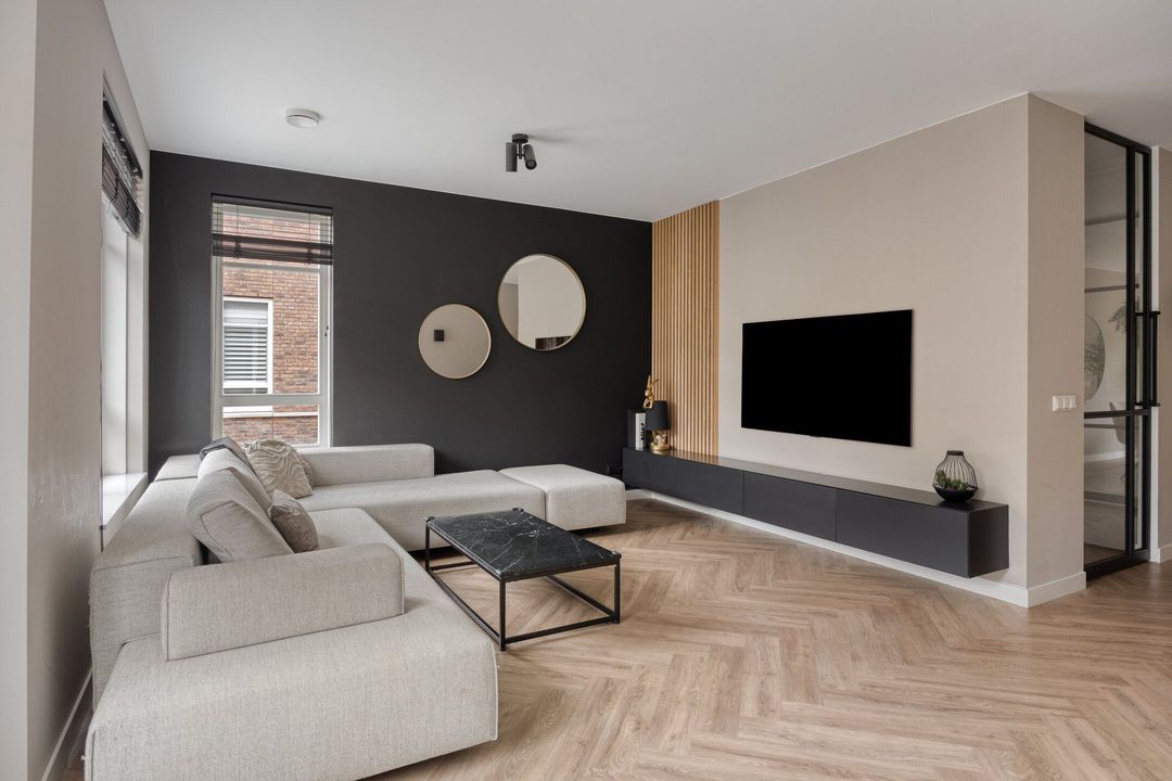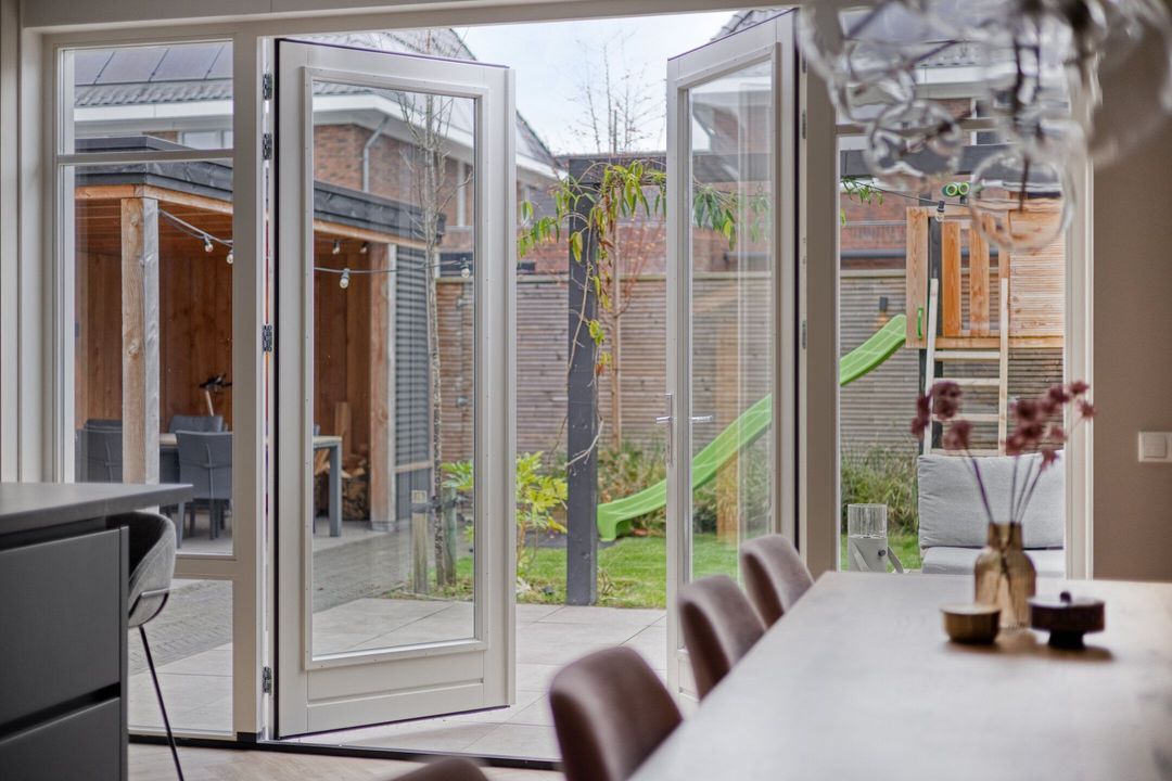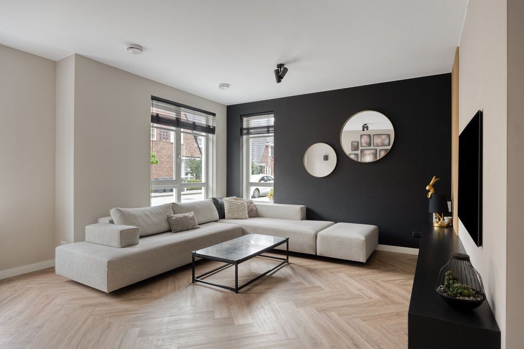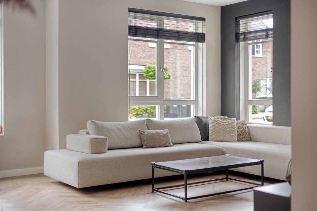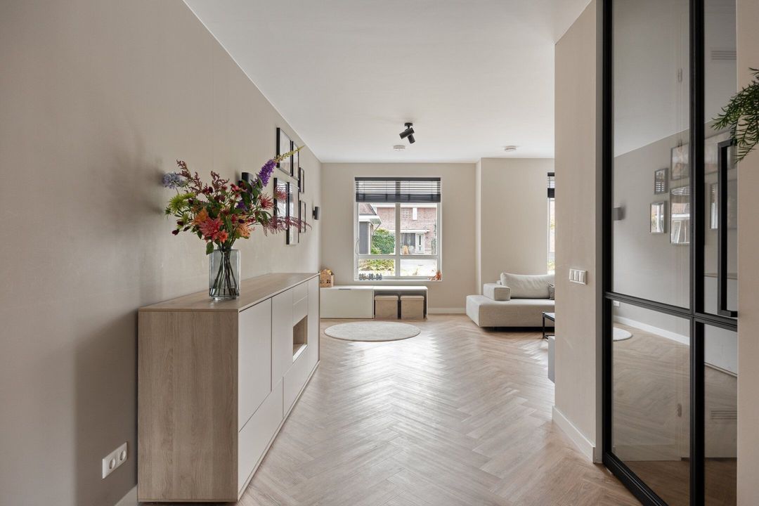 De woonkamer ligt aan de voorzijde en is bijzonder ruim en licht dankzij de grote raampartijen. De afwerking is hoogwaardig, met strakke lijnen en een rustige kleurenstelling. Via stalen openslaande taatsdeuren bereikt u de royale woonkeuken aan de achterzijde.