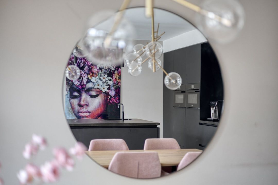 Located at the front of the home, the living room is particularly spacious and bright thanks to its large windows. The high-quality finishes, clean lines, and neutral color palette create a calm and elegant atmosphere. Through steel pivot doors, you enter the generous open-plan kitchen at the rear.