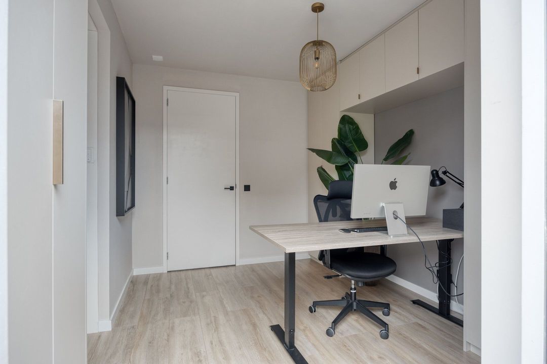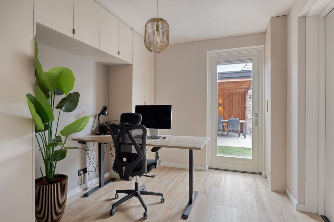 Aansluitend vindt u een multifunctionele ruimte, momenteel ingericht als kantoor met een op maat gemaakte kastenwand. Vanuit hier heeft u toegang tot zowel de tuin als de berging – ideaal voor de fietsen of extra opslag.