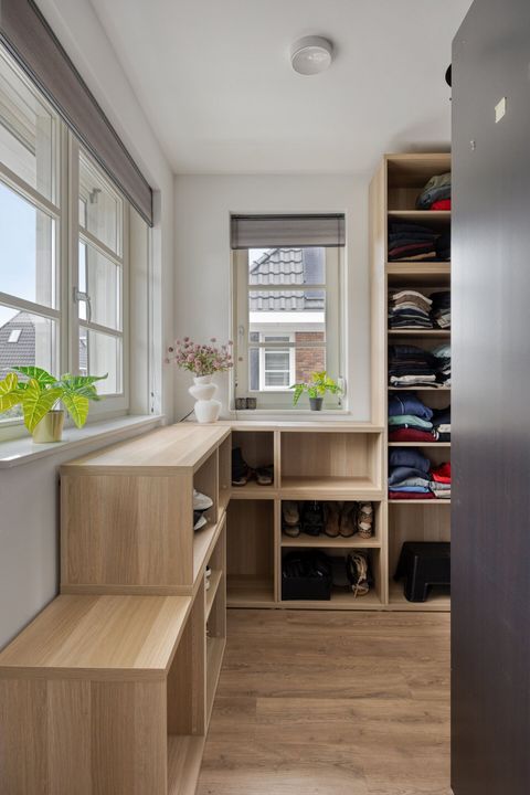 Adjacent is a multifunctional room, currently used as a home office with a custom-built wall unit. From here, you have access to both the garden and the storage room—ideal for bicycles or extra storage space.