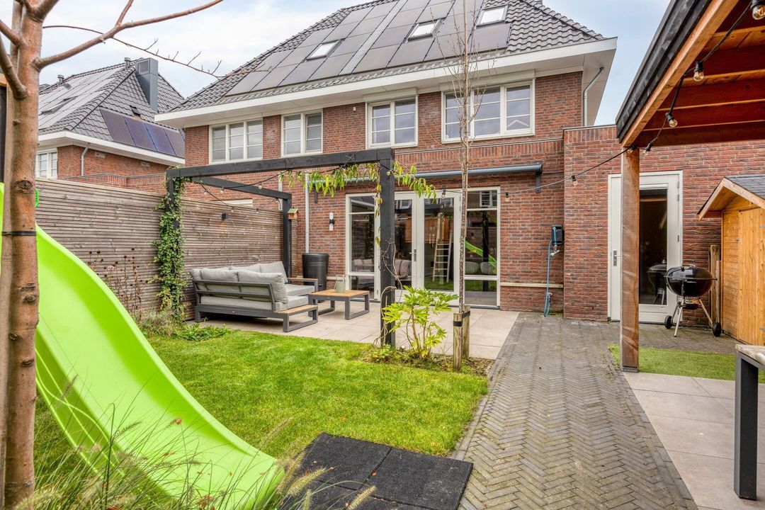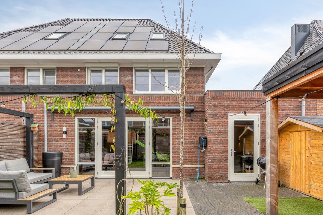 The beautifully landscaped west-facing garden is a wonderful place to enjoy the sun. It features a cozy covered terrace with wood-burning stove—perfect for long summer evenings around the table. There’s also a lawn, sun terrace, wooden garden shed, rear entrance, and retractable awning. The lush greenery and well-maintained layout make this a garden to enjoy all year round.