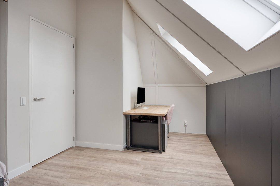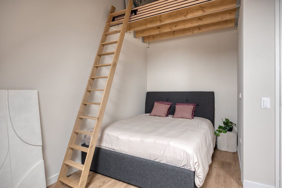 Slaapkamer 4 is speels ingericht met een vide en een moderne kastenwand over de volle breedte. Dankzij de dakramen (voorzien van screens) valt er veel natuurlijk licht binnen, en er is voldoende ruimte voor een bureau of werkplek.