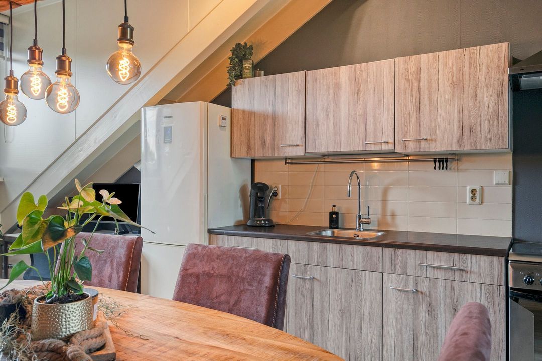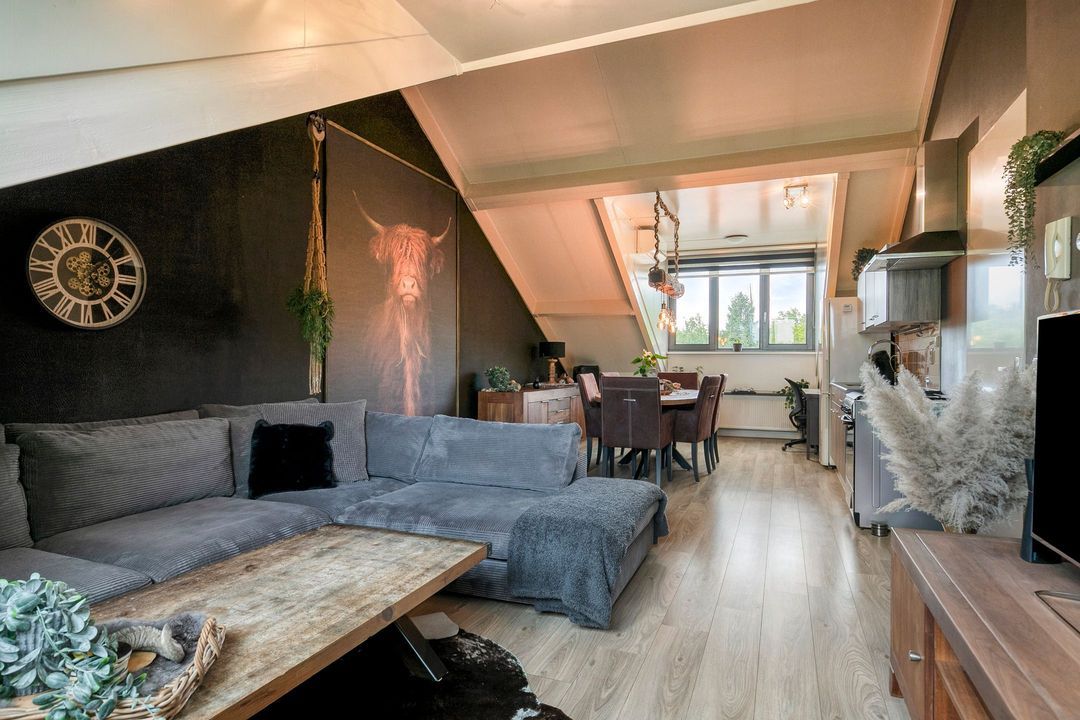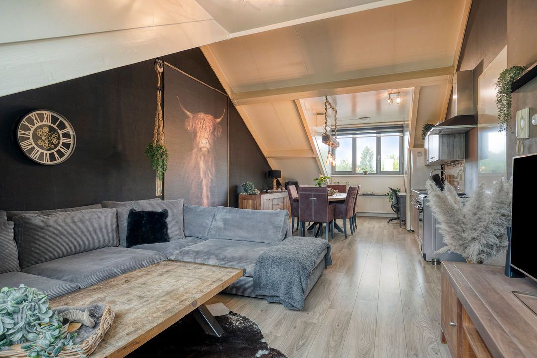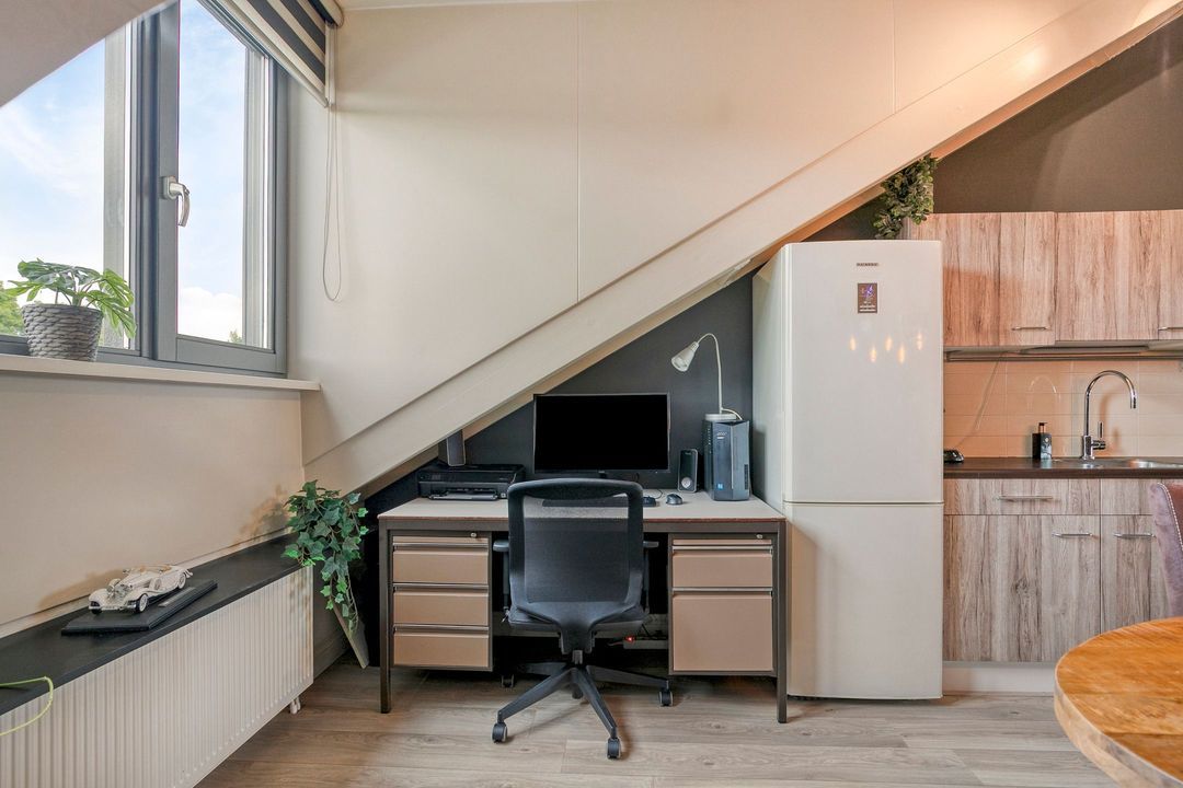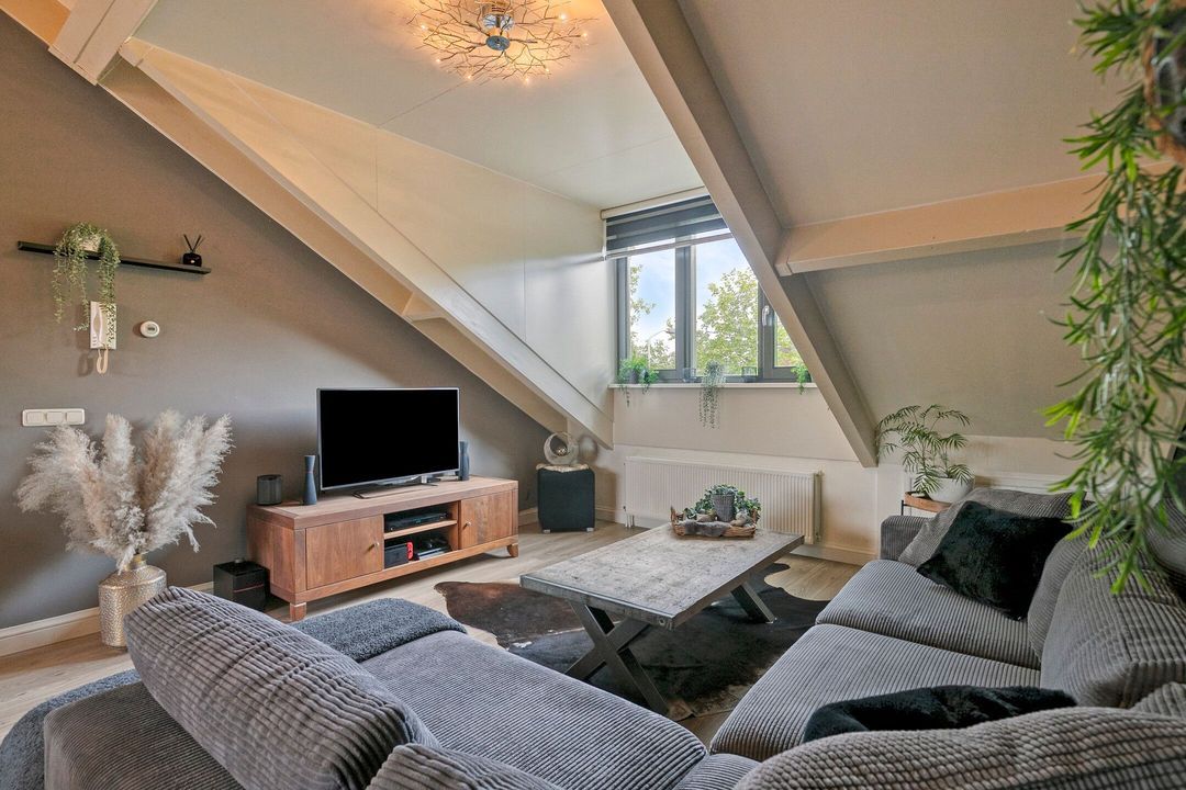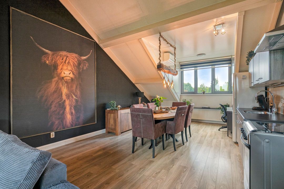 Het appartement beschikt over een ruime woonkamer met airconditioning en een dakkapel aan zowel de voor- als achterzijde, waardoor er veel natuurlijk licht binnenvalt. De woonkamer is afgewerkt met een laminaatvloer, terwijl de wanden en het plafond een speelse, strakke afwerking hebben, wat bijdraagt aan een moderne en gezellige sfeer. Door een plafond dat doorloopt tot aan de nok van de woning, heeft u nog meer het gevoel van ruimte.