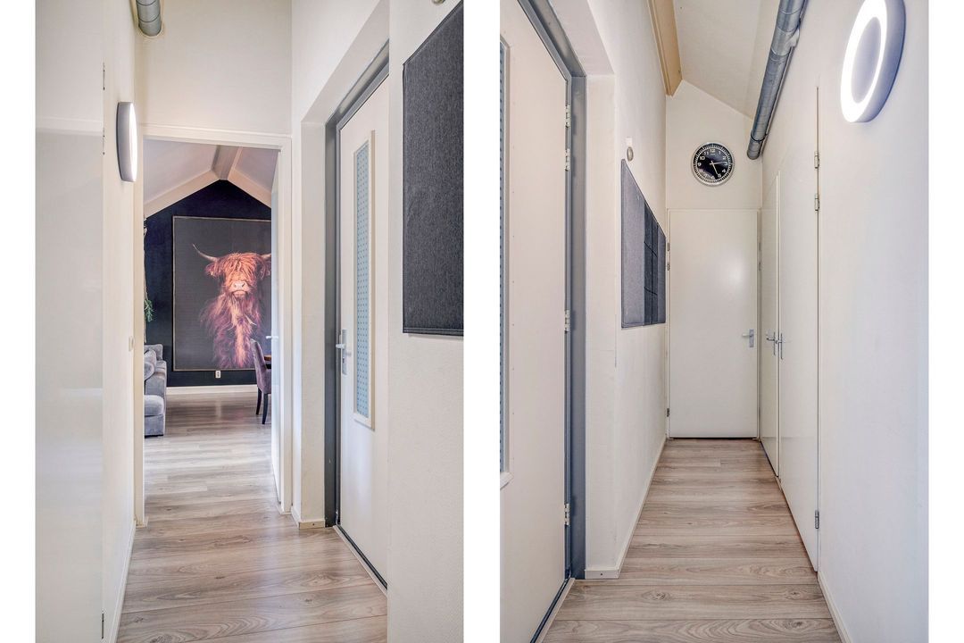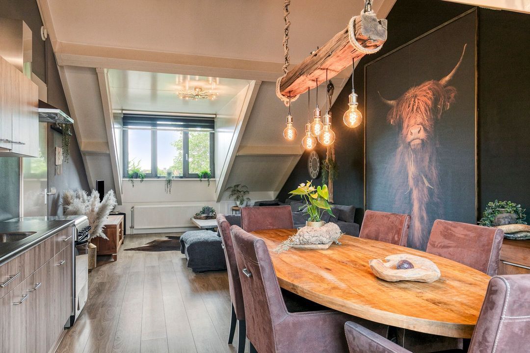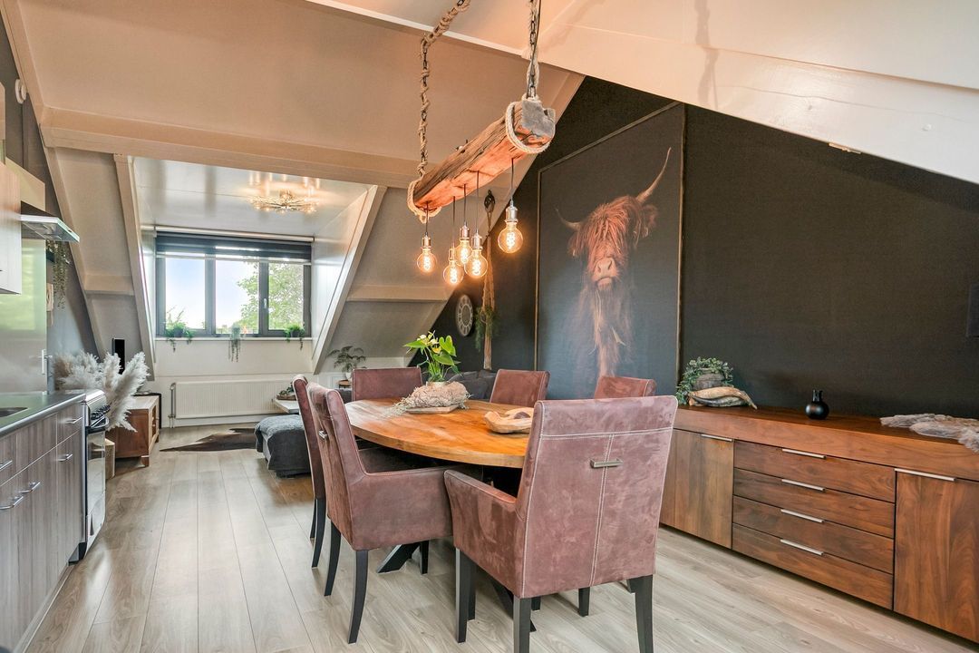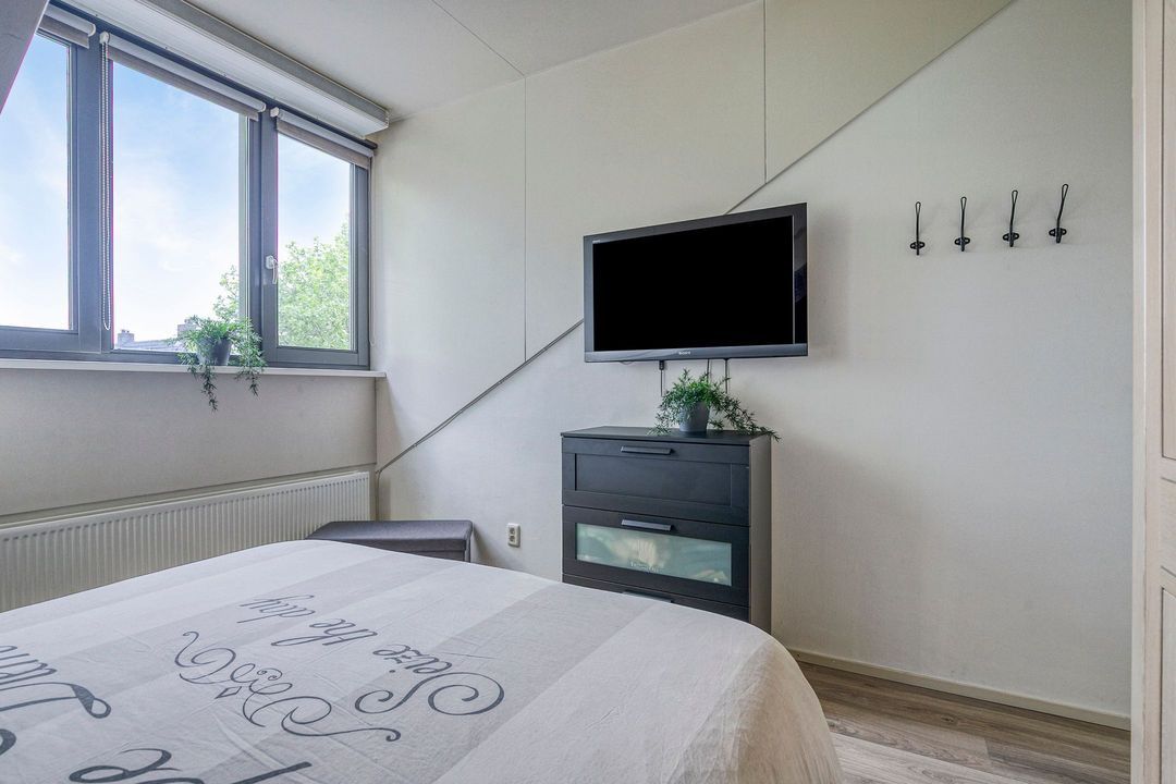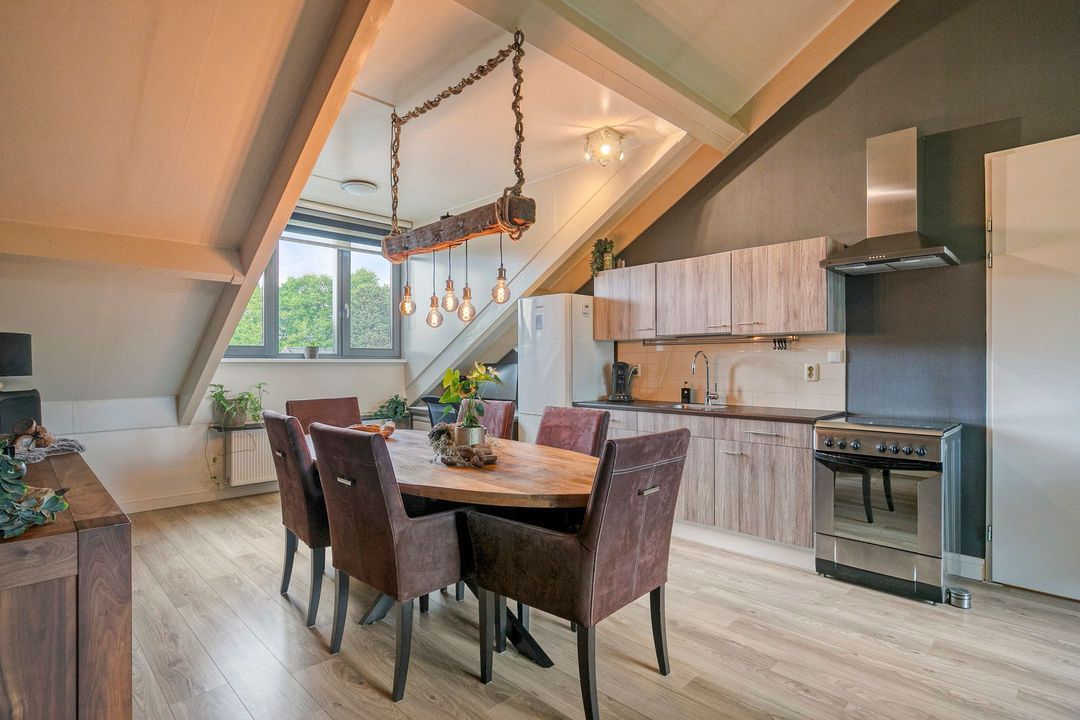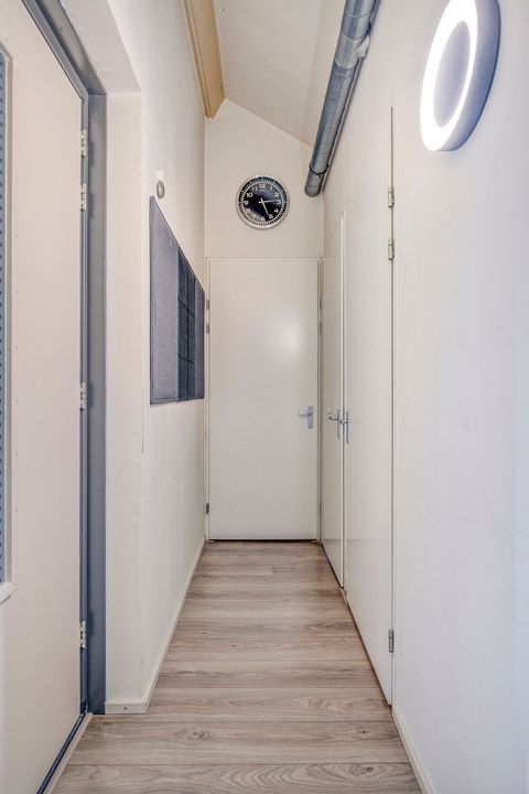 Het appartement beschikt over een ruime woonkamer met airconditioning en een dakkapel aan zowel de voor- als achterzijde, waardoor er veel natuurlijk licht binnenvalt. De woonkamer is afgewerkt met een laminaatvloer, terwijl de wanden en het plafond een speelse, strakke afwerking hebben, wat bijdraagt aan een moderne en gezellige sfeer. Door een plafond dat doorloopt tot aan de nok van de woning, heeft u nog meer het gevoel van ruimte.