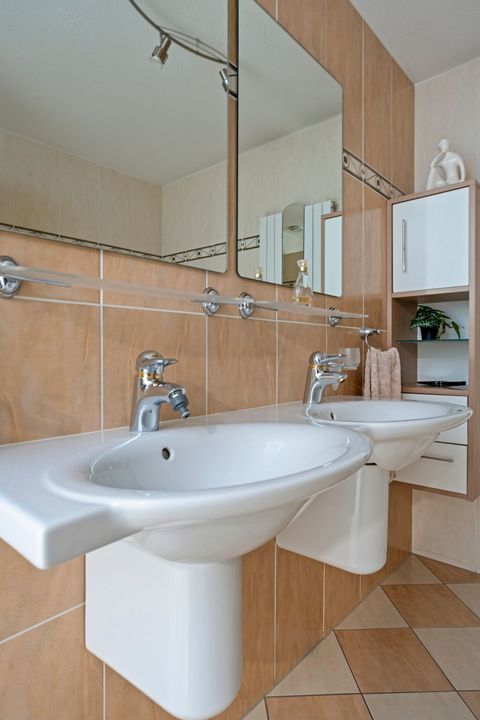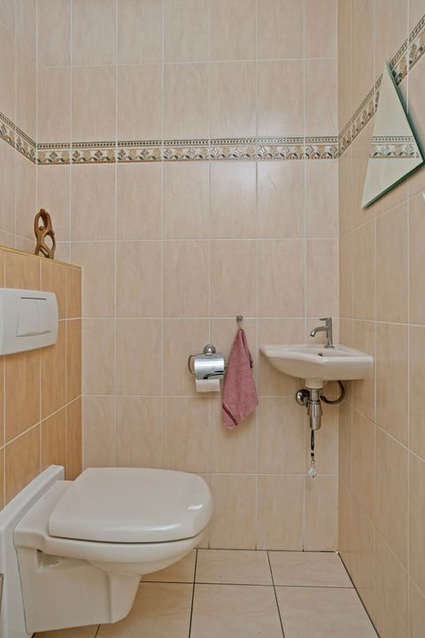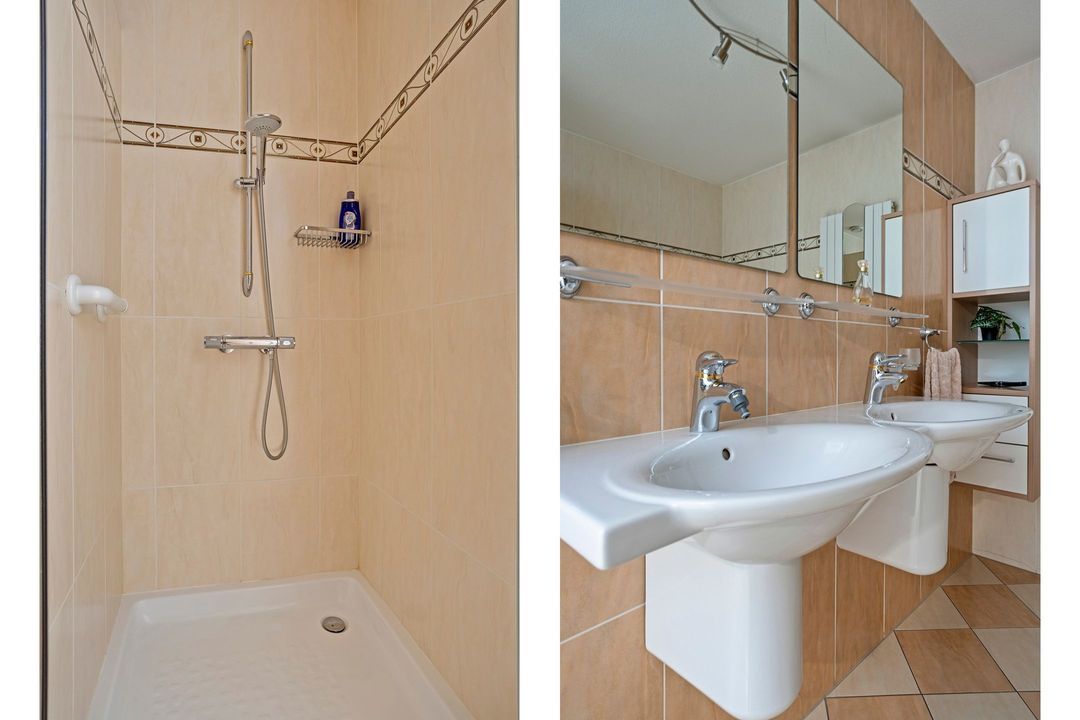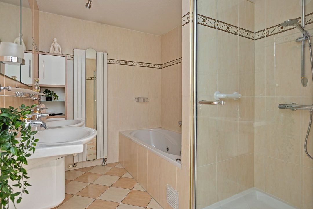 The neatly finished bathroom is fully tiled and features a separate shower, whirlpool bathtub, double washbasin, design radiator, and mechanical ventilation. There is also a separate toilet with a hand basin.