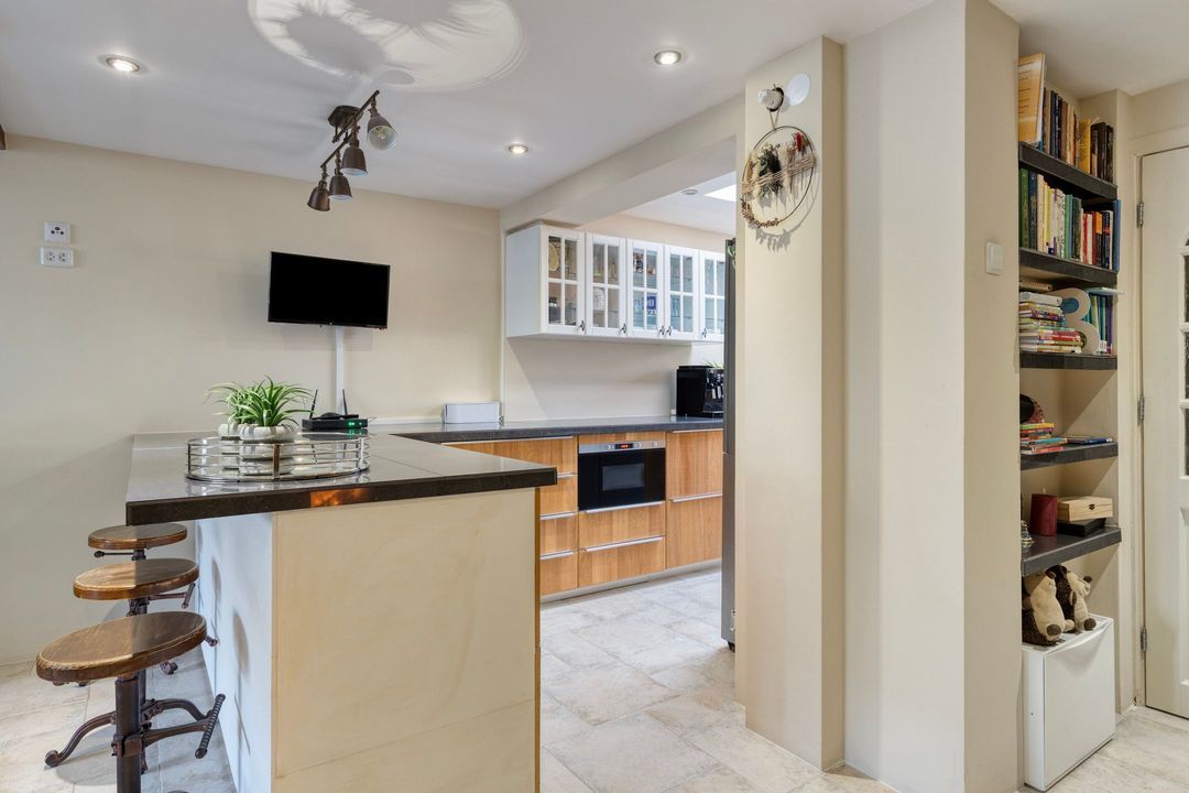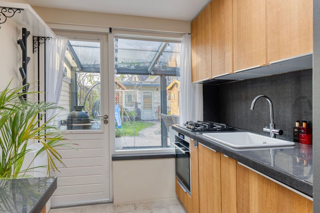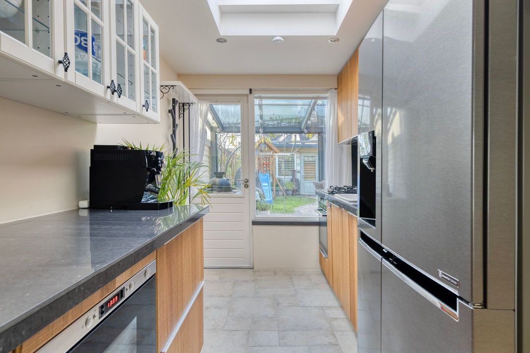 De keukeninrichting is aan de achterzijde van de woning gesitueerd en is in een L-opstelling gecombineerd met een wandopstelling geplaatst. Deze moderne keuken is onder meer voorzien van een Amerikaanse koelkast, oven, magnetron, een zeer groot betegeld aanrechtblad, een vaatwasser, spoelbak met mengkraan inclusief met kokend waterfunctie en een 4-pits gaskookplaat met afzuigkap. Er is meer dan voldoende opbergruimte door de vele onder- en bovenkasten. Dankzij de lichtkoepel komt hier extra natuurlijk licht binnen en via een loopdeur met zijraam heeft u toegang tot de aangebouwde serre en de tuin.
