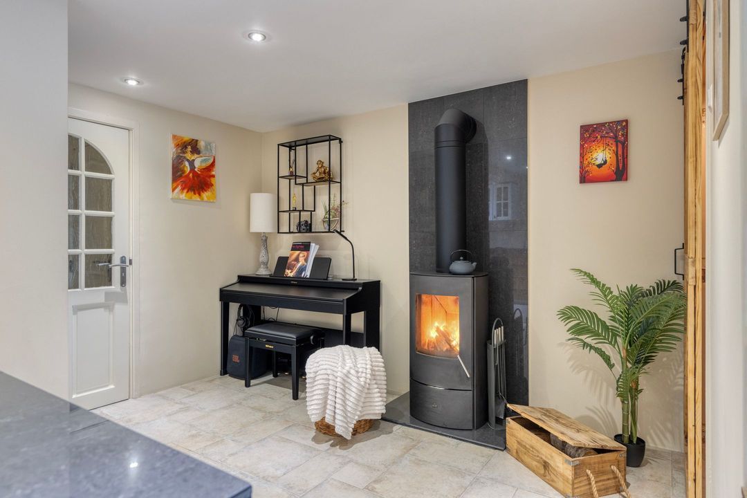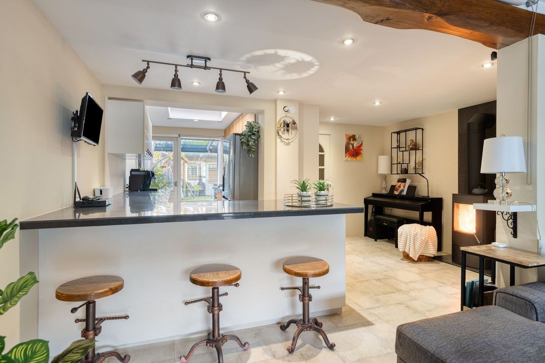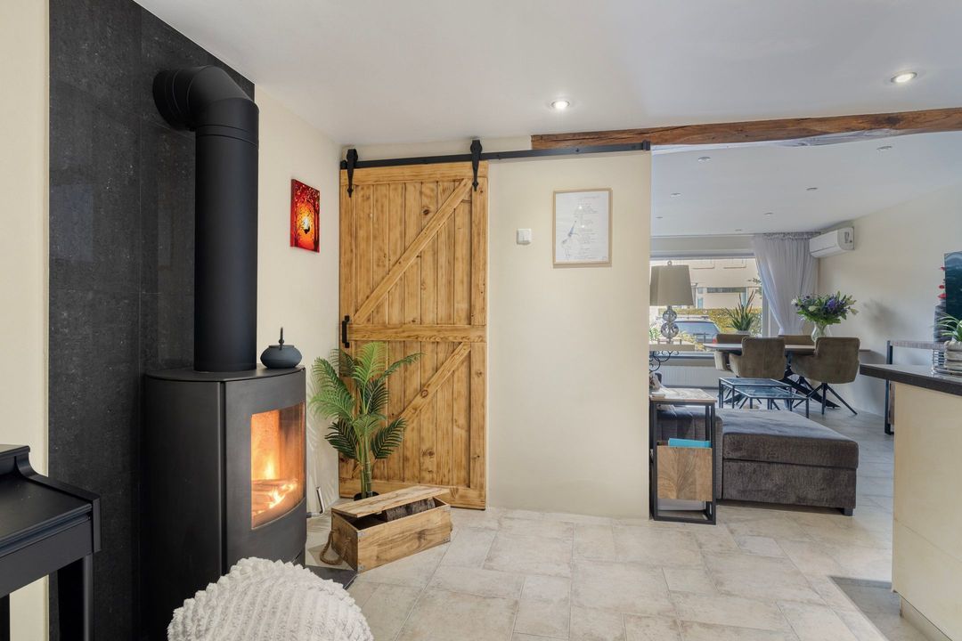 De woonkamer is voorzien van een moderne tegelvloer met eveneens vloerverwarming, strak gestuukte wanden en plafonds die zijn voorzien van inbouwspots. Het grote raam laat veel natuurlijk licht binnen en creëert een prettige, lichte sfeer. De woonkamer wordt geraffineerd gescheiden van de keuken door een fraaie eetbar maar staat eveneens in een goede verbinding met een knus en zeer gezellig loungegedeelte waar een sfeervolle houtkachel het geheel compleet maken. De aanwezigheid van airconditioning zorgt voor extra comfort in hele warme maar ook op hele koude dagen.