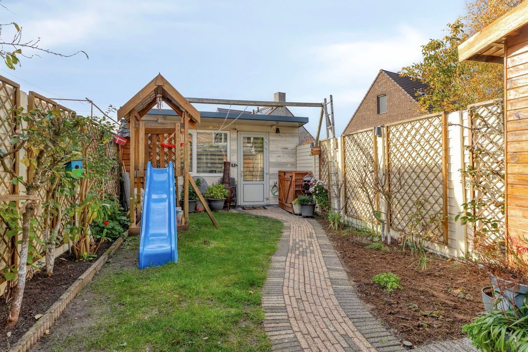 De zonovergoten achtertuin is gelegen op het zonnige westen en speels ingericht met een looppad naar het geïsoleerde tuinhuis, voorzien van elektra, tuinverlichting en een wateraansluiting. Daarnaast is er een gazon, borders met beplanting, een speeltoestel en een houten berging met elektra. De tuin beschikt bovendien over een sproei-installatie, waardoor deze altijd fraai onderhouden kan worden.