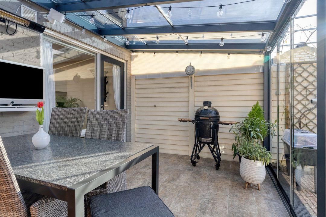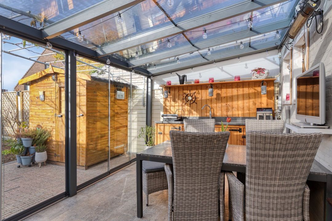 De serre is een sfeervolle uitbreiding van de woning, voorzien van een mobile buitenkeuken, mooie terras tegelvloer, warmtelampen, verlichting en veel lichtinval. Een ideale plek om te genieten van buitengevoel met het comfort van binnen.