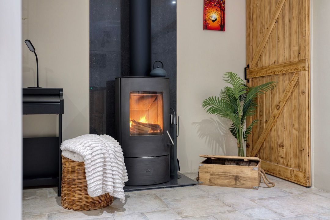 The living room features a modern tiled floor with underfloor heating, smooth plastered walls and ceilings fitted with recessed spotlights. A large window lets in abundant natural light, creating a bright and pleasant atmosphere. The living room is elegantly divided from the kitchen by a stylish breakfast bar and also connects to a cosy lounge area where an atmospheric wood-burning stove completes the scene. Air conditioning provides extra comfort on very warm — and also on very cold — days.