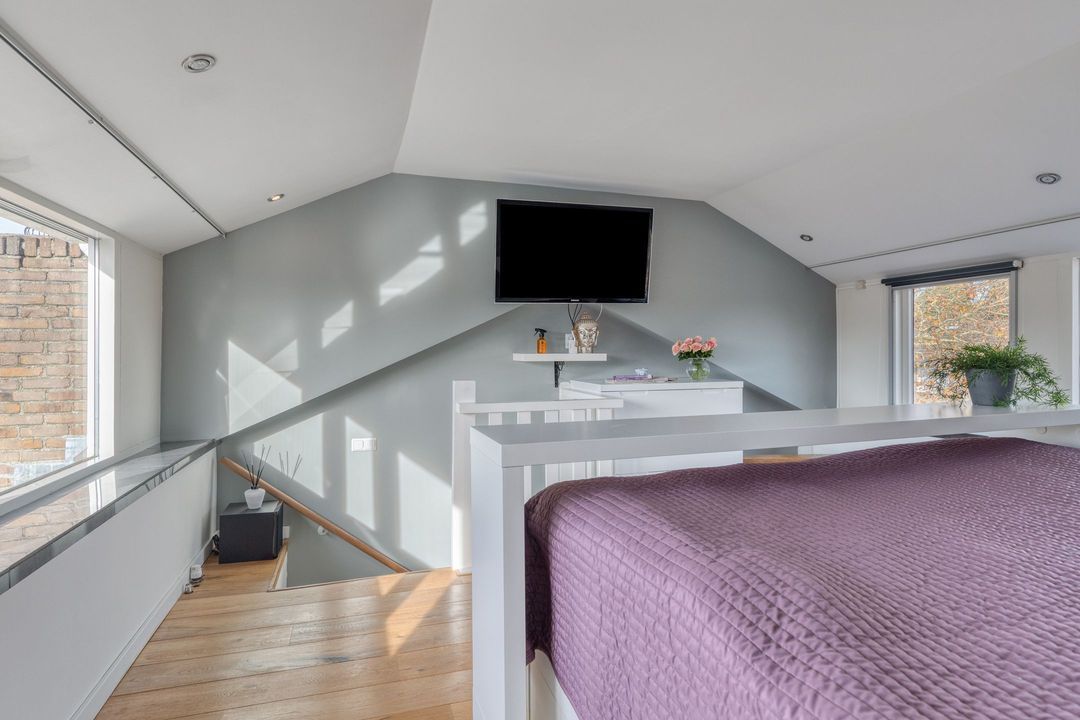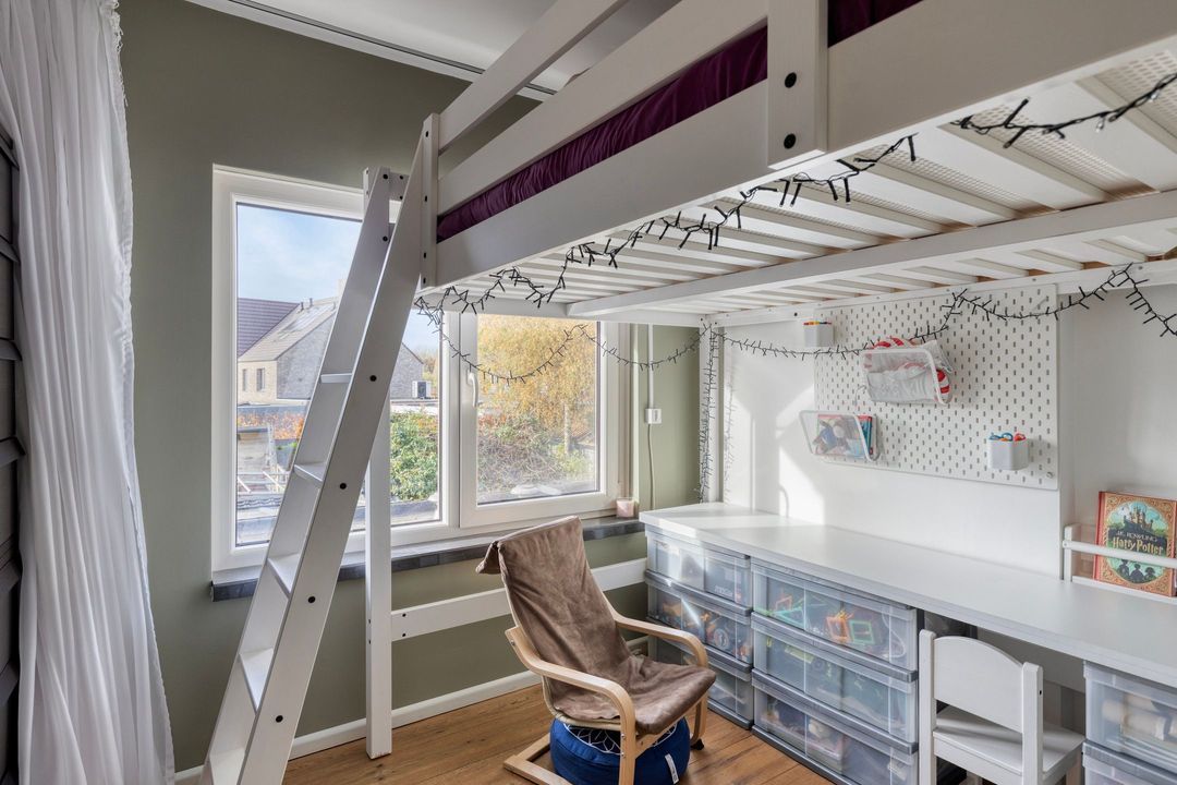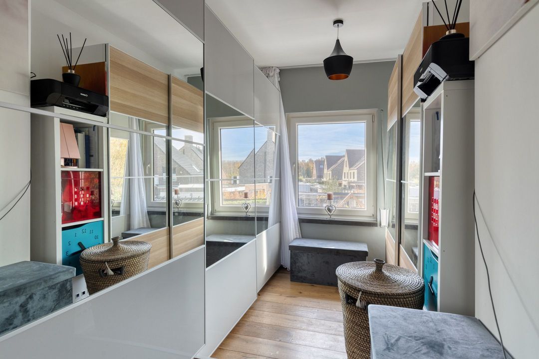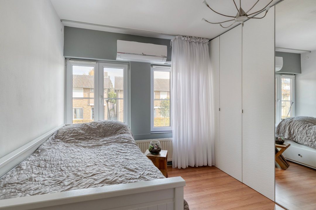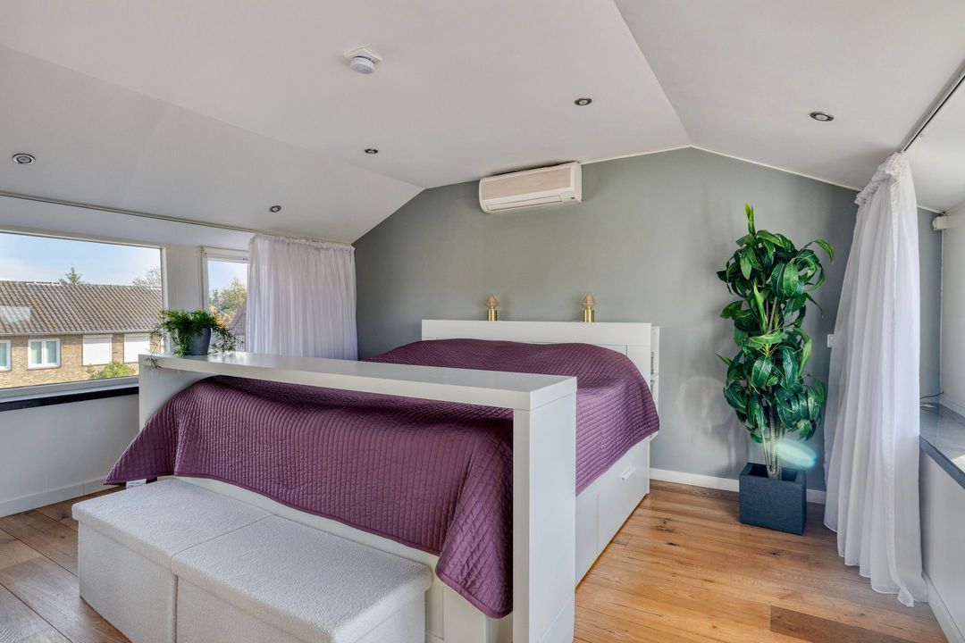 A fixed staircase leads to the very spacious, raised attic floor which has large dormer windows on both sides. Air conditioning, recessed spotlights, roller shutters and a beautiful oak floor with underfloor heating make this master bedroom a very pleasant space. The smooth plastered walls and ceiling, also fitted with recessed lighting, complete the room.