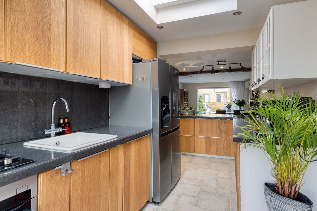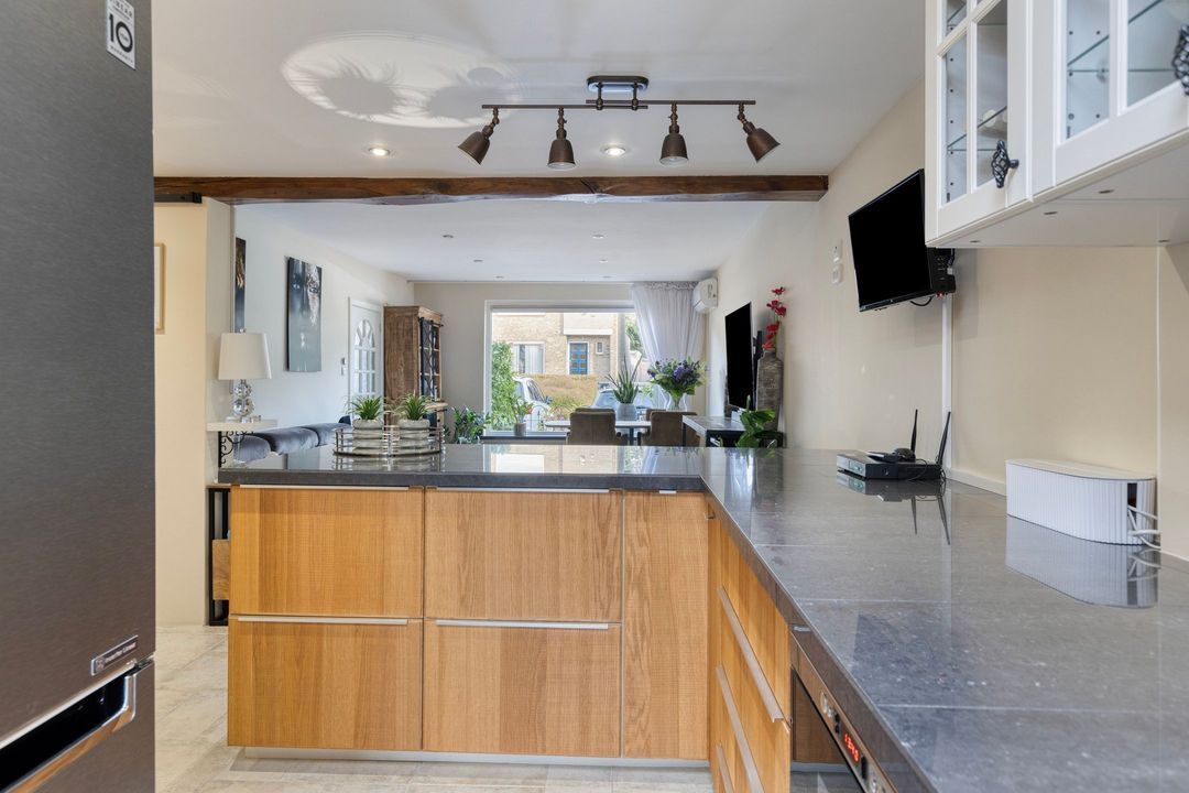 The kitchen is located at the rear and has an L-shaped layout combined with a wall unit. This modern kitchen includes, among other things, an American-style fridge, oven, microwave, an extra-large tiled work surface, dishwasher, sink with mixer tap including boiling-water function, and a 4-burner gas hob with extractor. There is ample storage space thanks to numerous base and wall units. A roof light brings additional daylight into the kitchen and a side-windowed door gives access to the attached conservatory and the garden.