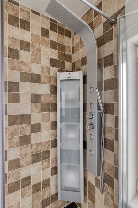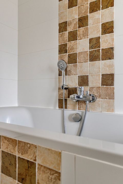 The modern, fully tiled bathroom features a generous bathtub with whirlpool, a double washbasin set in an attractive vanity unit with good storage and a mirrored cabinet, a toilet and a walk-in shower with a luxurious sunshower and massage shower heads. Underfloor heating and a window contribute to a luxurious and comfortable bathroom.