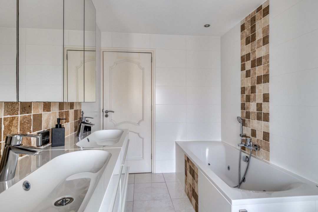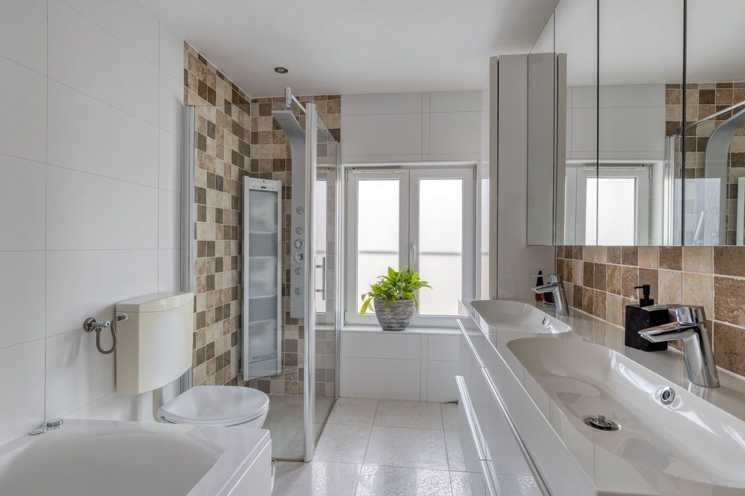 De moderne, volledig betegelde badkamer beschikt over een royaal ligbad met whirlpoolfunctie, dubbele wastafel in een fraai meubelombouw met fijne opbergruimte uitgerust met een spiegelkast met opbergruimte, toilet en een inloopdouche met een luxe sunshower en design doucheconsole met massagedouchekoppen. De vloerverwarming draagt evenals een raampartij bij aan een luxe en comfortabele badkamer.
