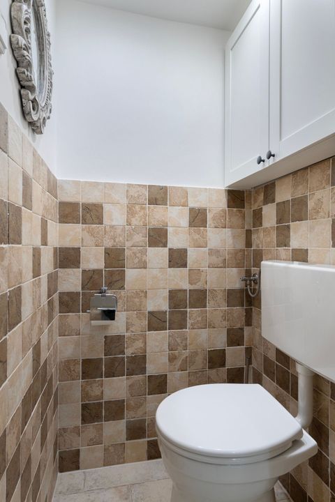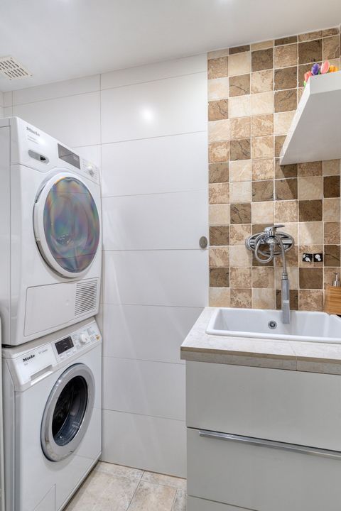 Adjacent to the lounge area there is a vestibule providing access to the toilet and to a very practical laundry room, fitted with a fixed washbasin in a stylish cabinet and connections for appliances.