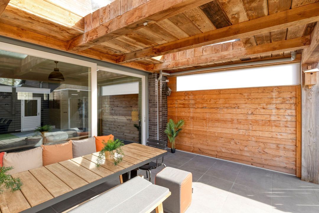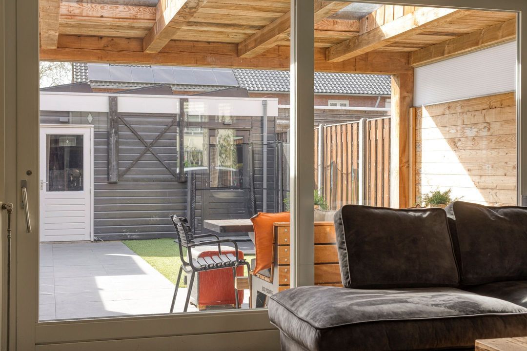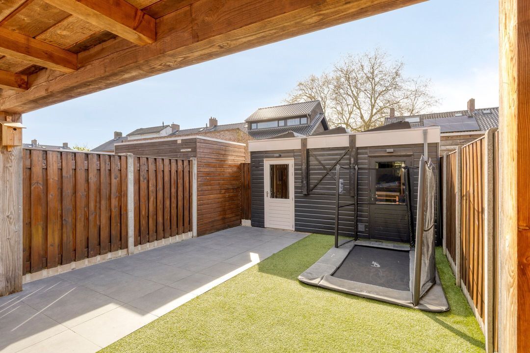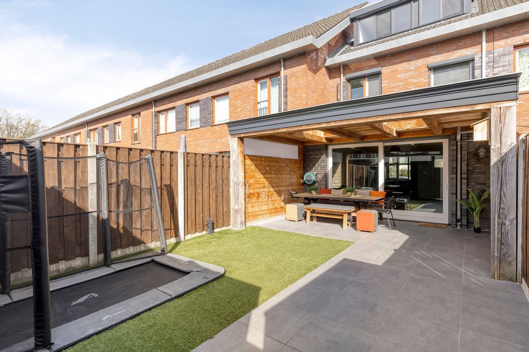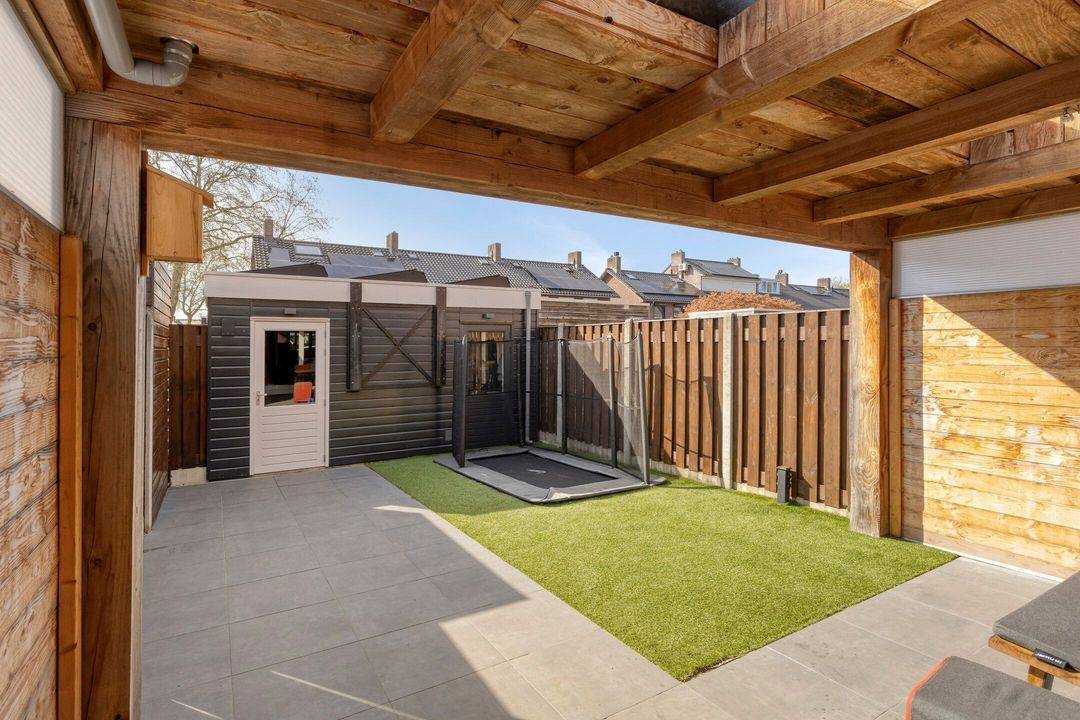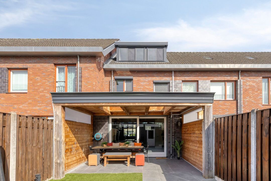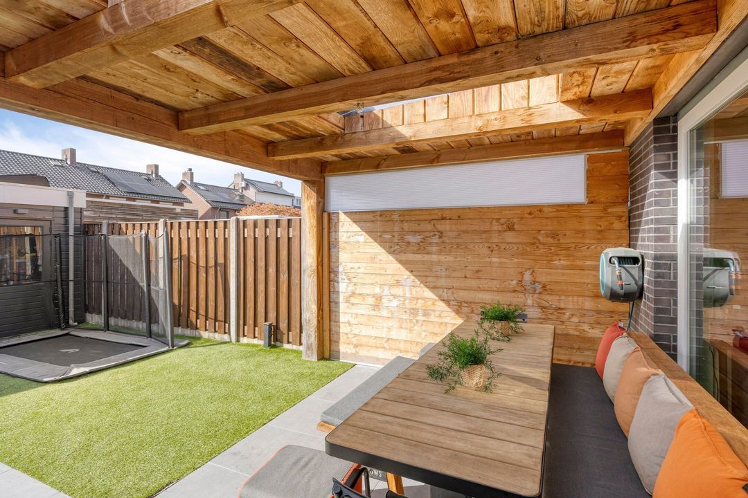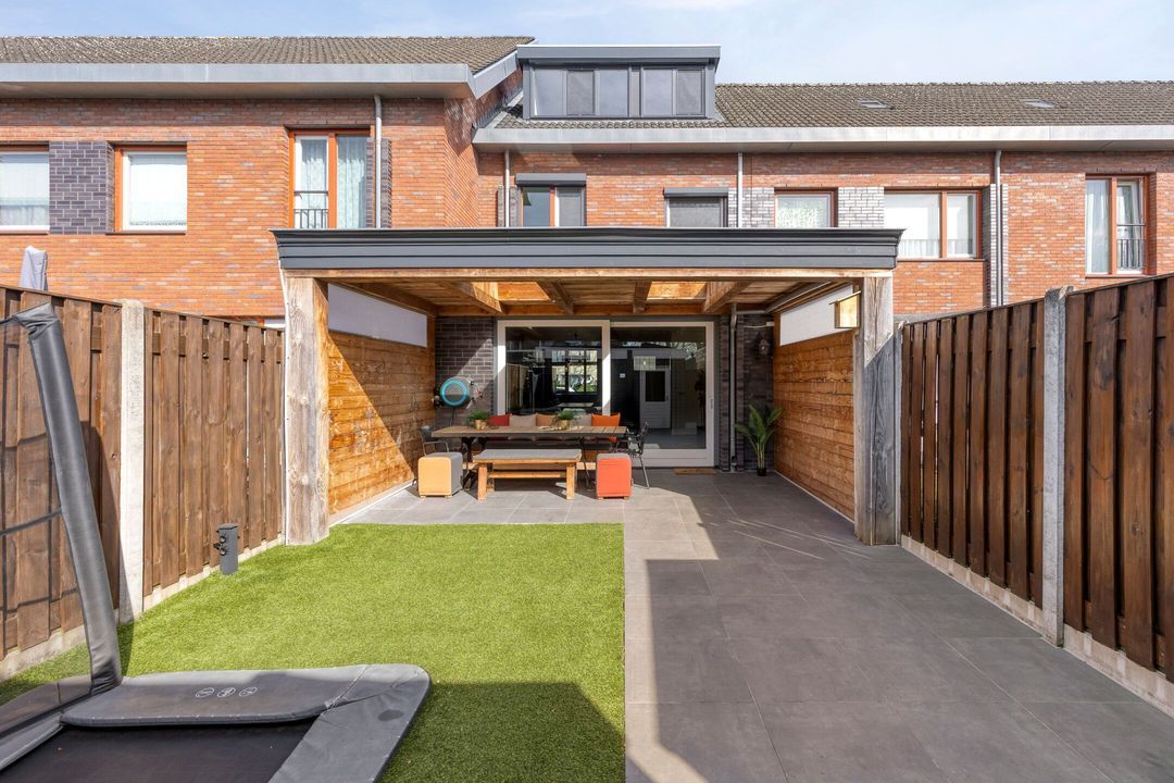 Via de schuifpui bereikt u de tuin die is uitgerust met een fijne terrasoverkapping voorzien van twee lichtstraten, waardoor u het hele jaar door geniet van een lichte en beschutte buitenruimte. De tuin is verder aangelegd met moderne terrastegels en onderhoudsvriendelijk kunstgras.