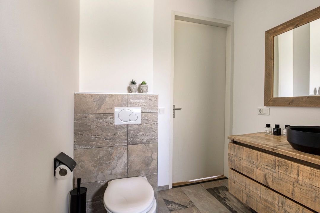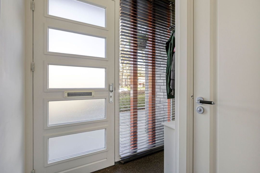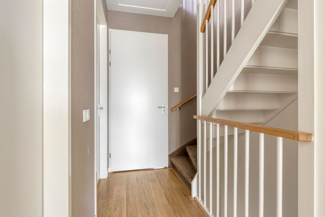 You enter into a bright hallway with a very pleasant amount of natural light. The hall is equipped with a wardrobe, a modern guest toilet, and the meter cupboard. From here, you have access to the spacious living room and kitchen, and the staircase leads to the first floor. The property is characterized by beautiful high interior doors, which create a stylish and spacious appearance.