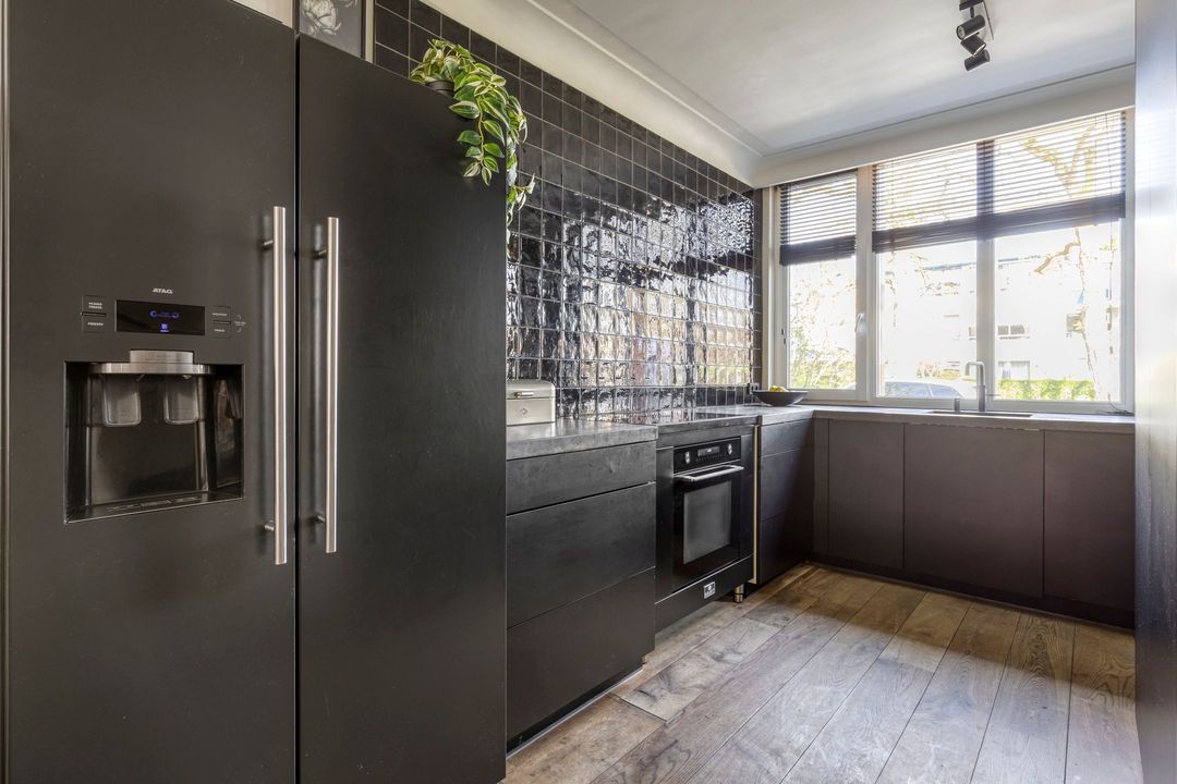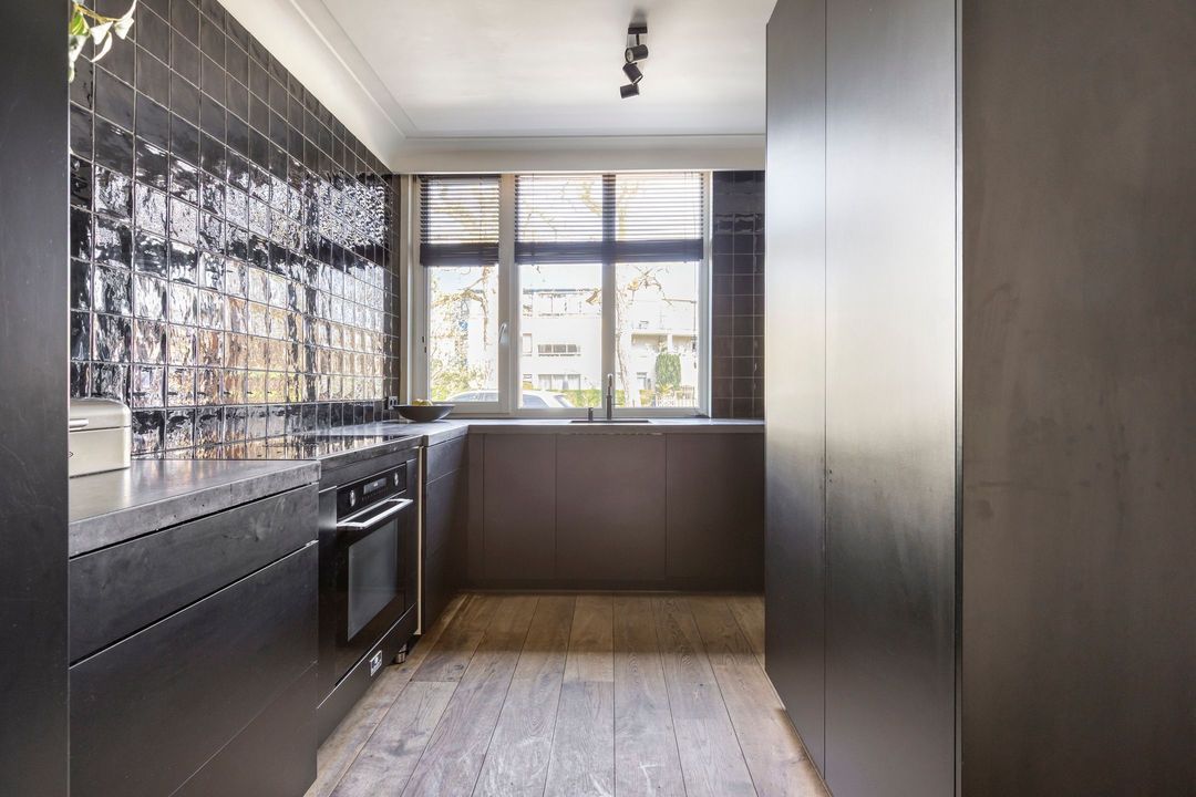 Vanuit de keuken zorgt een raampartij met draai-kiepfunctie voor extra ventilatie maar eveneens voor een fijn uitzicht op de voorgelegen straat en ruime plantsoen.