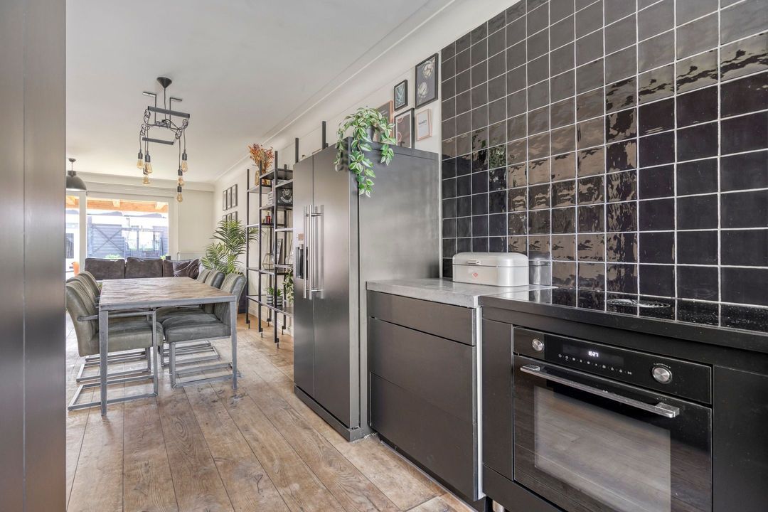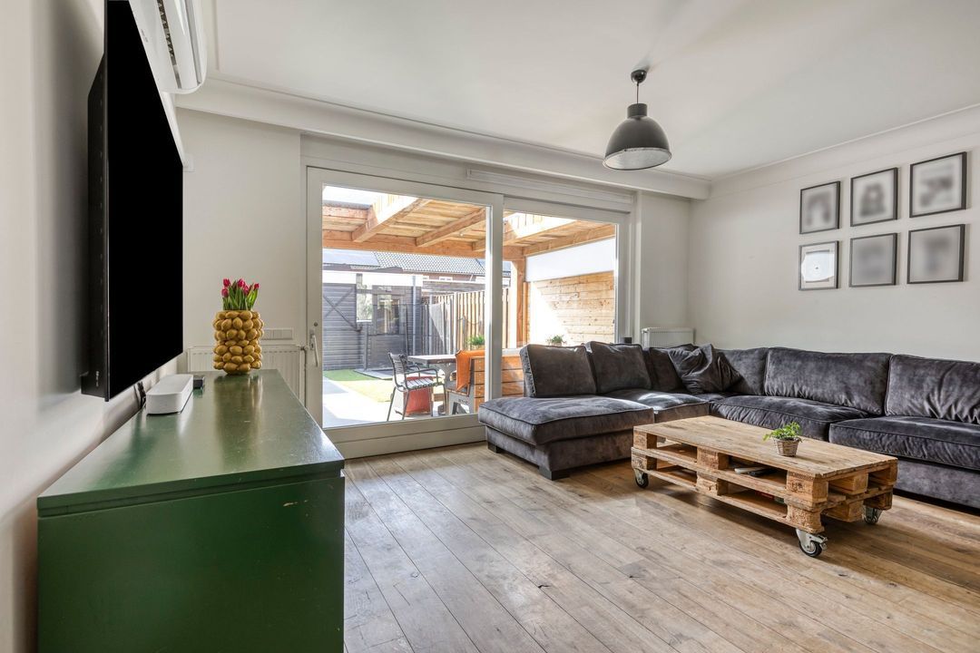 Aan de achterzijde bevindt zich het zitgedeelte met prachtig uitzicht op de tuin. De grote schuifpui zorgt voor een fijne verbinding tussen binnen en buiten en laat de leefruimte optimaal tot zijn recht komen. Daarnaast is de woonkamer voorzien van airconditioning, wat bijdraagt aan extra wooncomfort gedurende alle seizoenen.