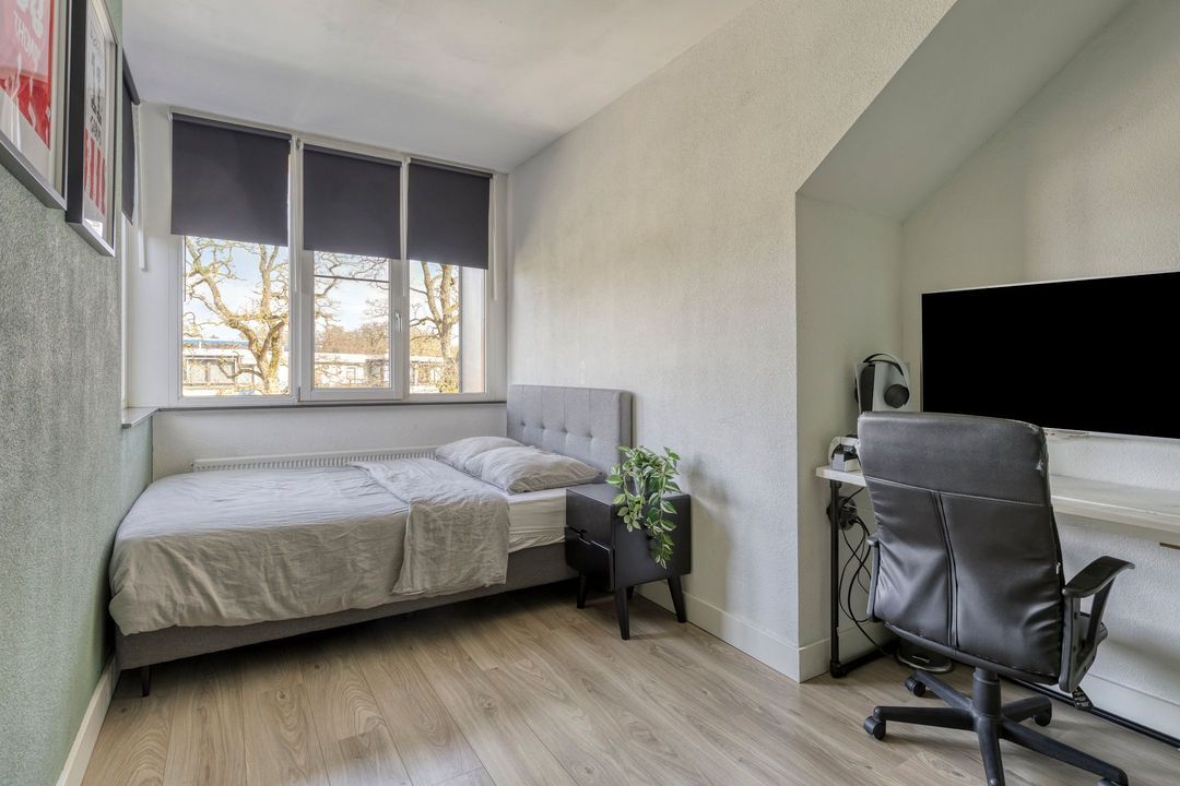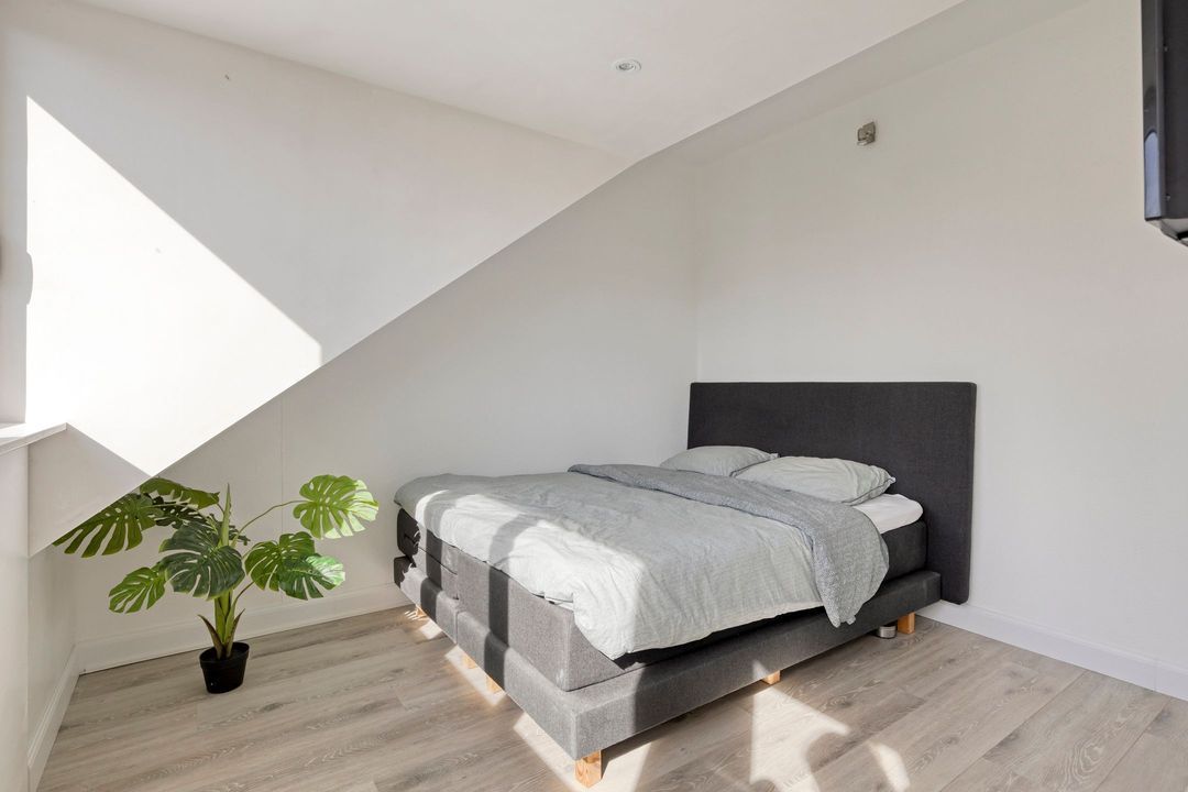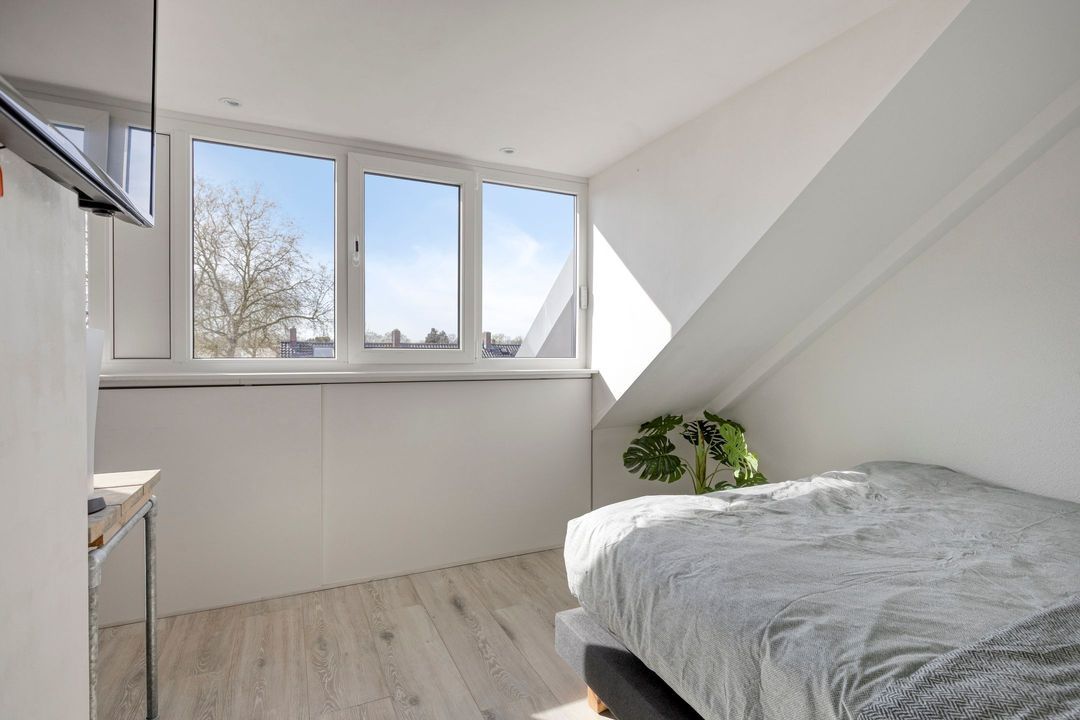 De slaapkamers zijn voorzien van een laminaatvloer en beschikken over een strak gestukte plafonds met eveneens fraaie sierlijsten. De houten kozijnen zijn voorzien van HR glas en hebben een draai-kiepfunctie met dauerluftung, wat zorgt voor een prettig wooncomfort en extra ventilatie. De hoofdslaapkamer beschikt bovendien over een ruime, ingebouwde kledingkast.