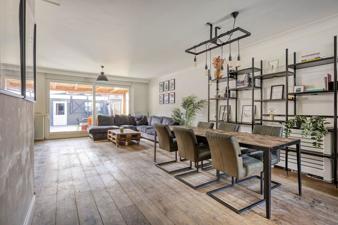 De woonkamer is zeer royaal van opzet en beschikt over een massief houten vloer, die warmte en karakter aan de ruimte geeft. Dankzij de grote raampartijen aan de voor- en voornamelijk aan de achterzijde, geniet u hier van veel natuurlijk lichtinval.