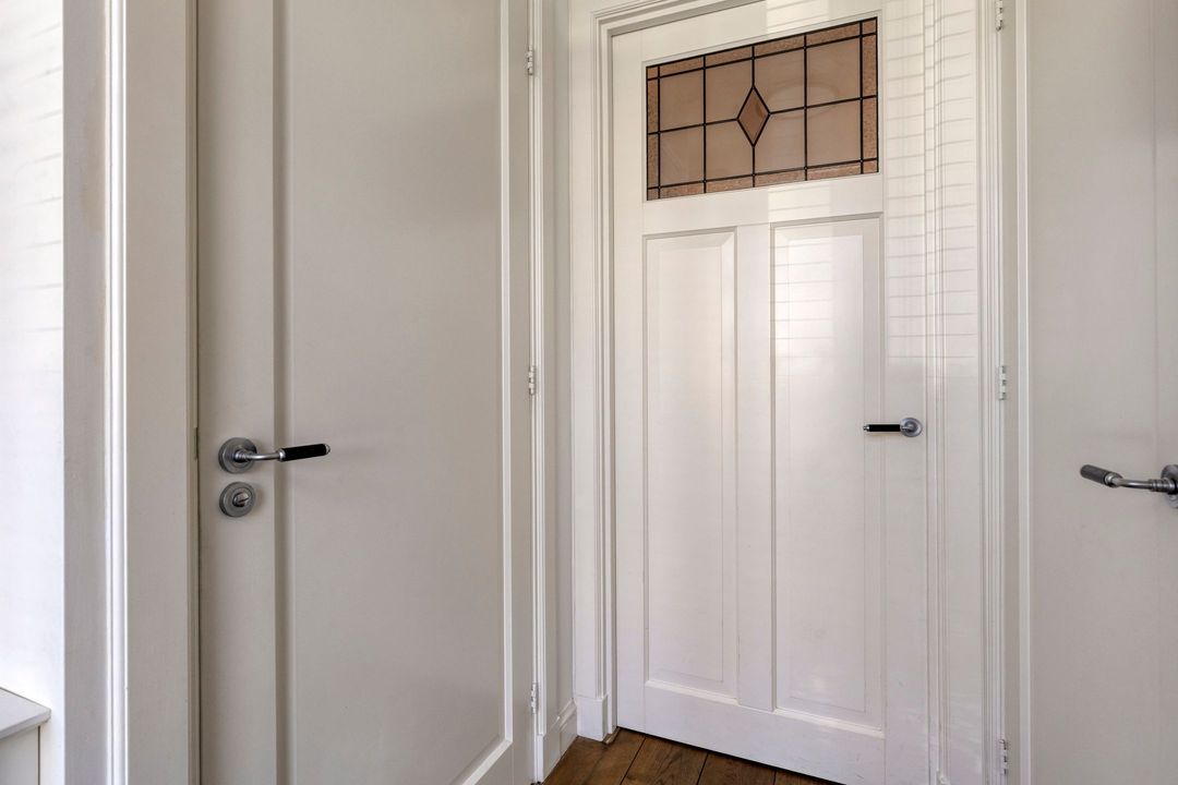 U komt binnen in een lichte hal met een zeer aangename hoeveelheid lichtinval. De hal is voorzien van een garderobe, een modern gastentoilet en de meterkast. Voorts heeft u toegang tot de royale woonkamer, keuken en de trap biedt u toegang tot de eerste verdieping. De woning kenmerkt zich door de prachtige hoge binnendeuren, die zorgen voor een stijlvolle en ruimtelijke uitstraling.