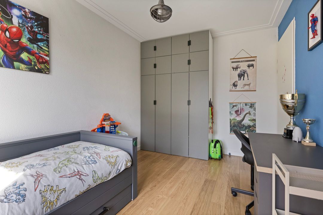 The bedrooms feature laminate flooring and have neatly plastered ceilings with decorative moldings. The wooden window frames are fitted with HR glass and have a tilt-and-turn function with ventilation option, ensuring a comfortable living environment and extra airflow. The master bedroom also includes a spacious built-in wardrobe.