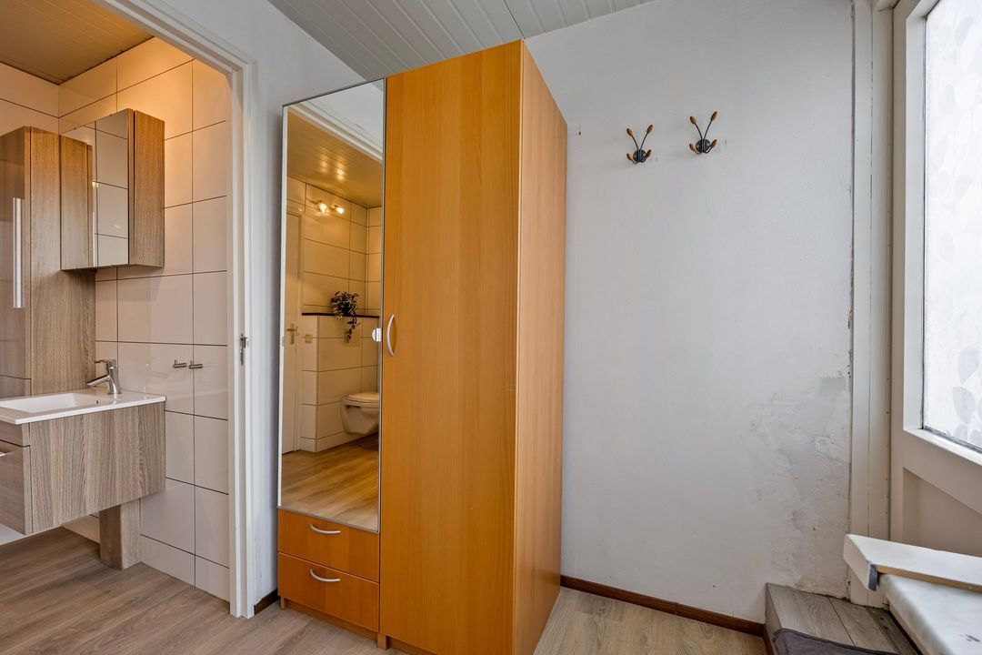 In de bijkeuken bevinden zich de witgoedaansluitingen en een tweede garderobe. Via een loopdeur bereikt u een kantoorruimte en is er een loopdeur nar de tuin.