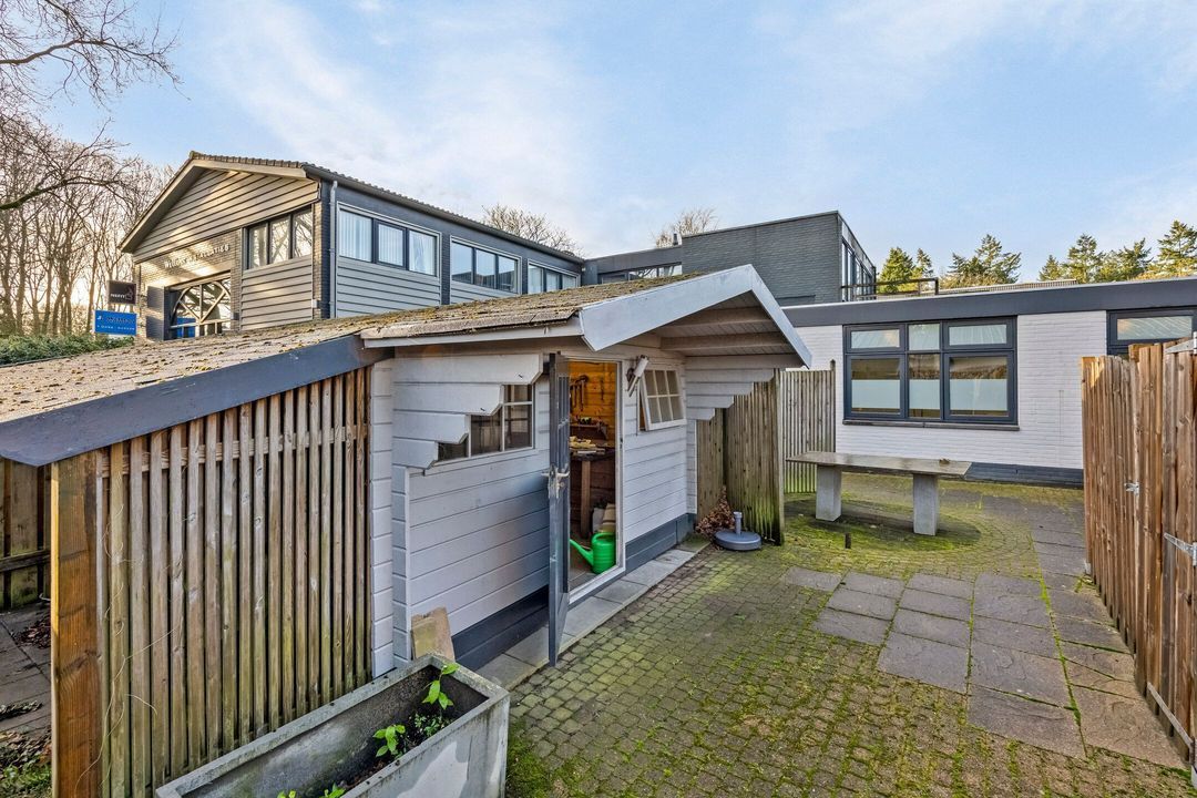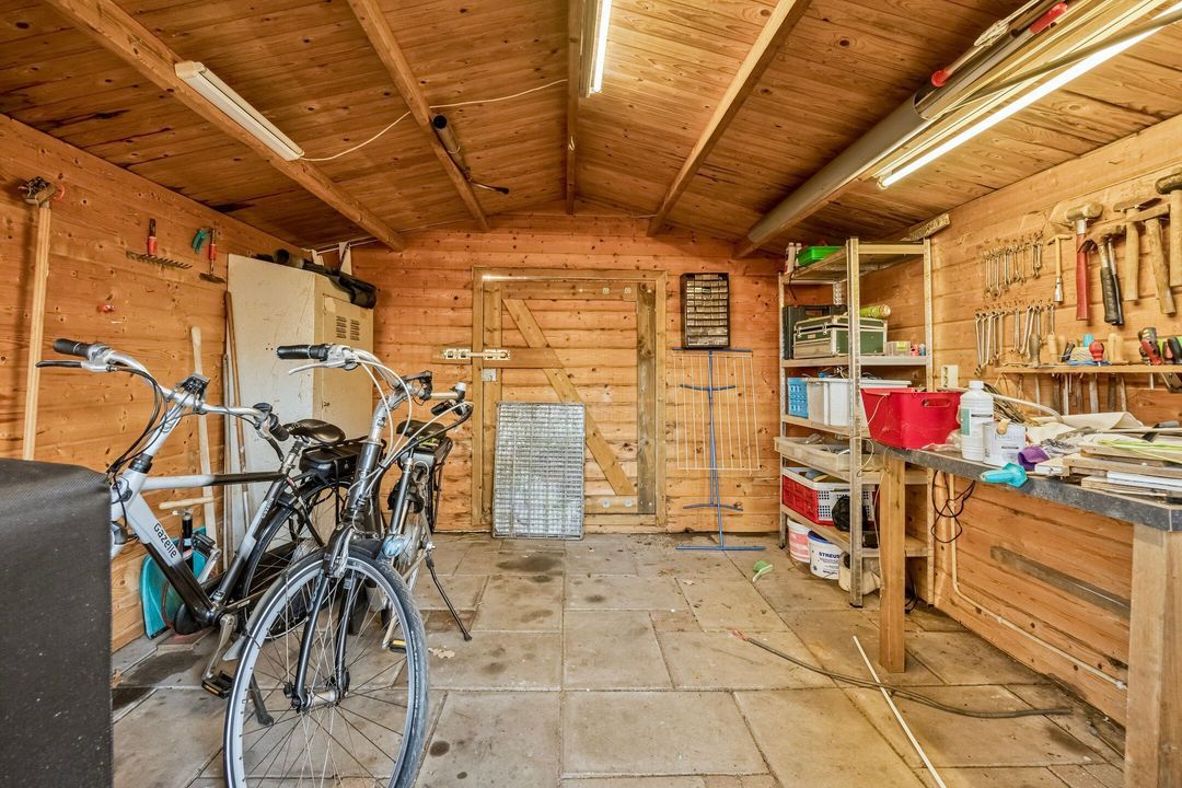 Daarnaast beschikt u over een aparte toegang naar een houten tuinhuis, gelegen naast de oprit. Dit biedt mogelijkheden voor het stallen van fietsen, tuingereedschap of extra opslag.