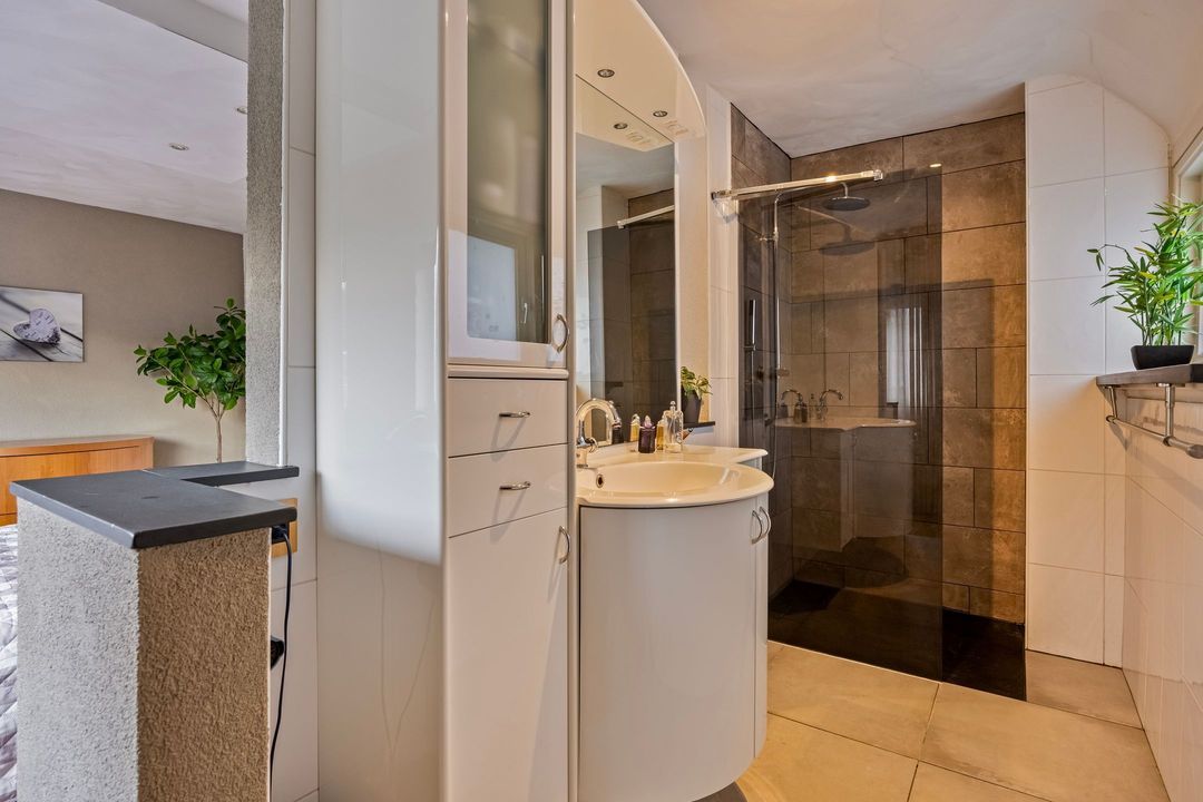 Deze royale ouderslaapkamer is ruim van opzet en voorzien van een laminaat vloer. De wanden en plafond zijn voorzien van stukwerk. Aan de ene zijde van de kamer is de ensuite badkamer gelegen. Hier is een inloopdouche gemaakt met een vaste wastafel in praktisch meubelombouw. Aan de andere zijde van de slaapkamer is een fijne inloop kleedruimte gecreëerd.