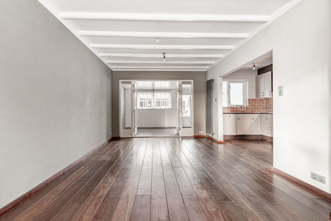 The beautiful living room features large windows providing abundant natural light and a clear view at the front. The solid wooden floor and neutral modern finishes give the room a timeless and inviting feel. From the living room, you have direct access to the attached conservatory, which leads to the sunny backyard.
