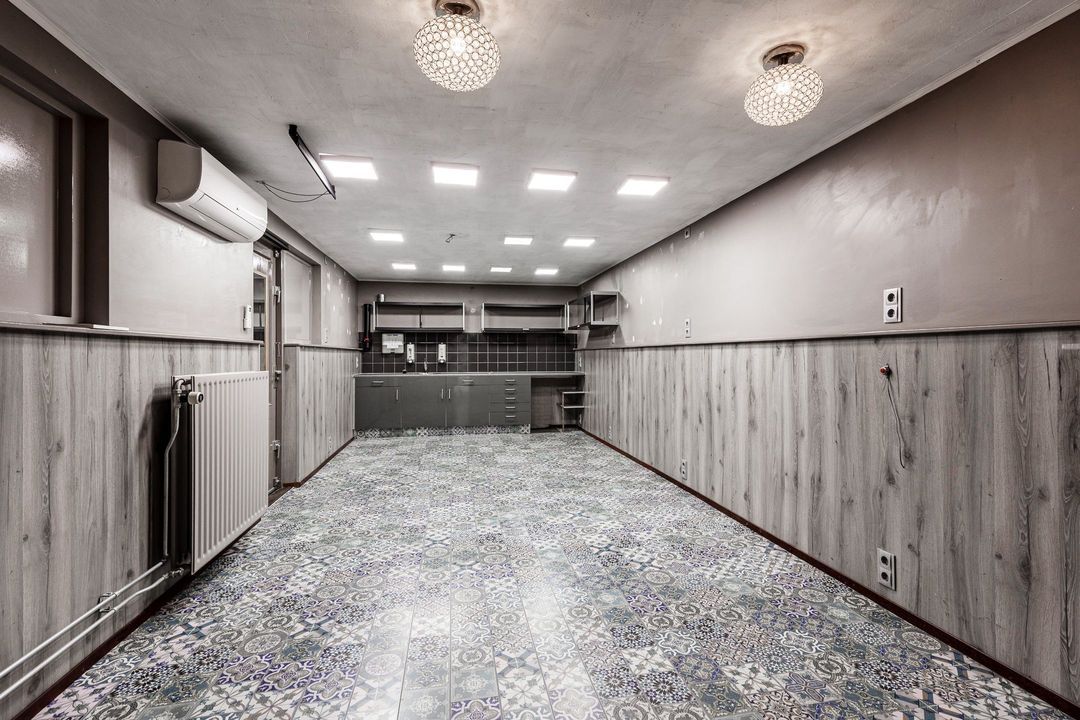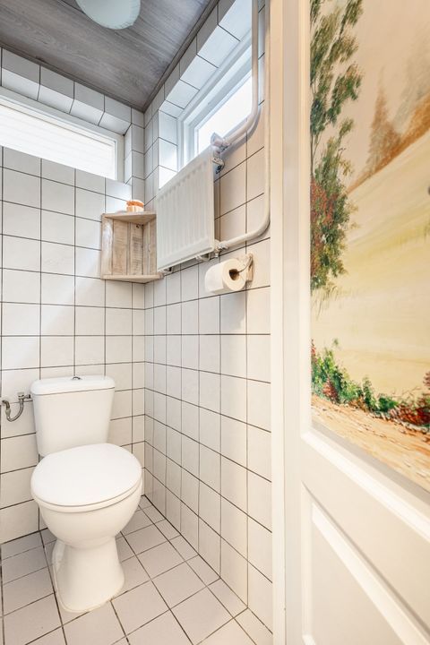 Behind the characteristic facade, you will find a cozy and contemporary interior with a welcoming living room, three bedrooms, a modern bathroom, and a large multifunctional heated garage/hobby room with a kitchenette, air conditioning, and a separate toilet.