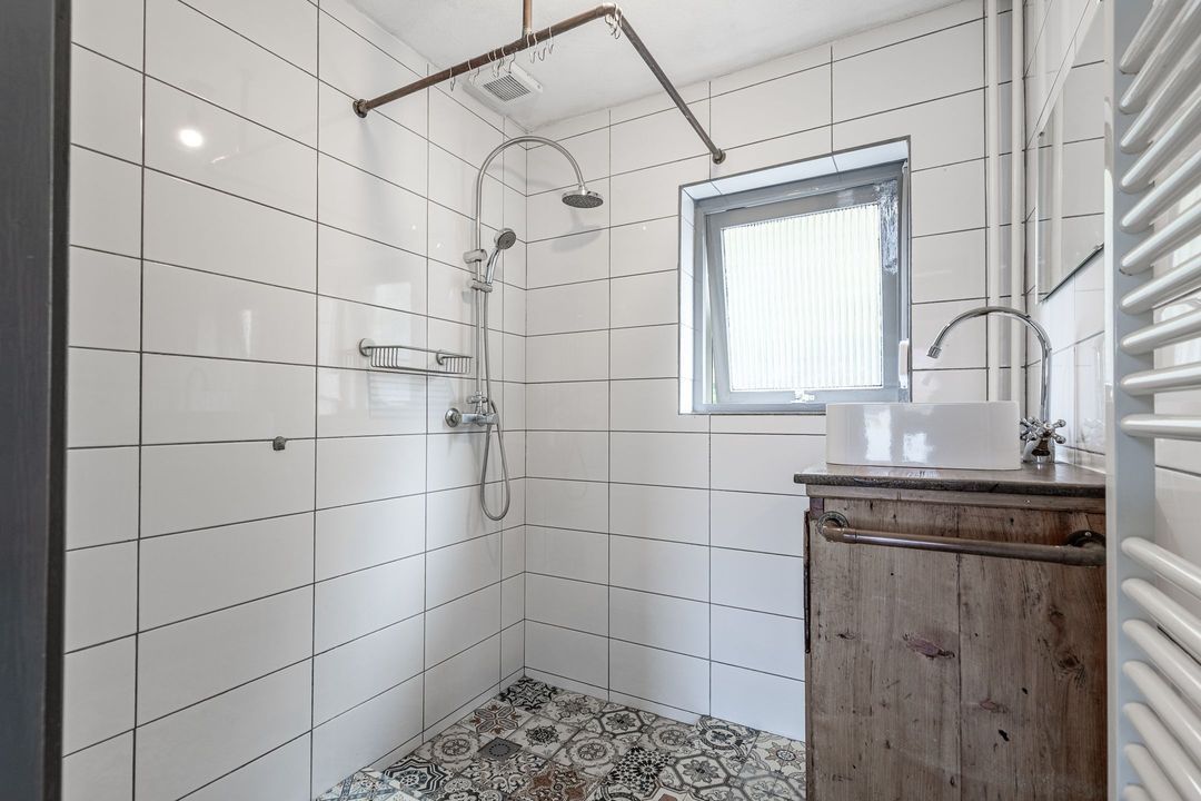 De moderne doucheruimte is eigentijds afgewerkt en praktisch ingericht. Hier vindt u een doucheruimte en wastafel in een praktisch meubel. Een raampartij zorgt voor daglichttoetreding en natuurlijke ventilatiemogelijkheden. De badkamer biedt een frisse en lichte uitstraling en is direct te gebruiken zonder renovatie.