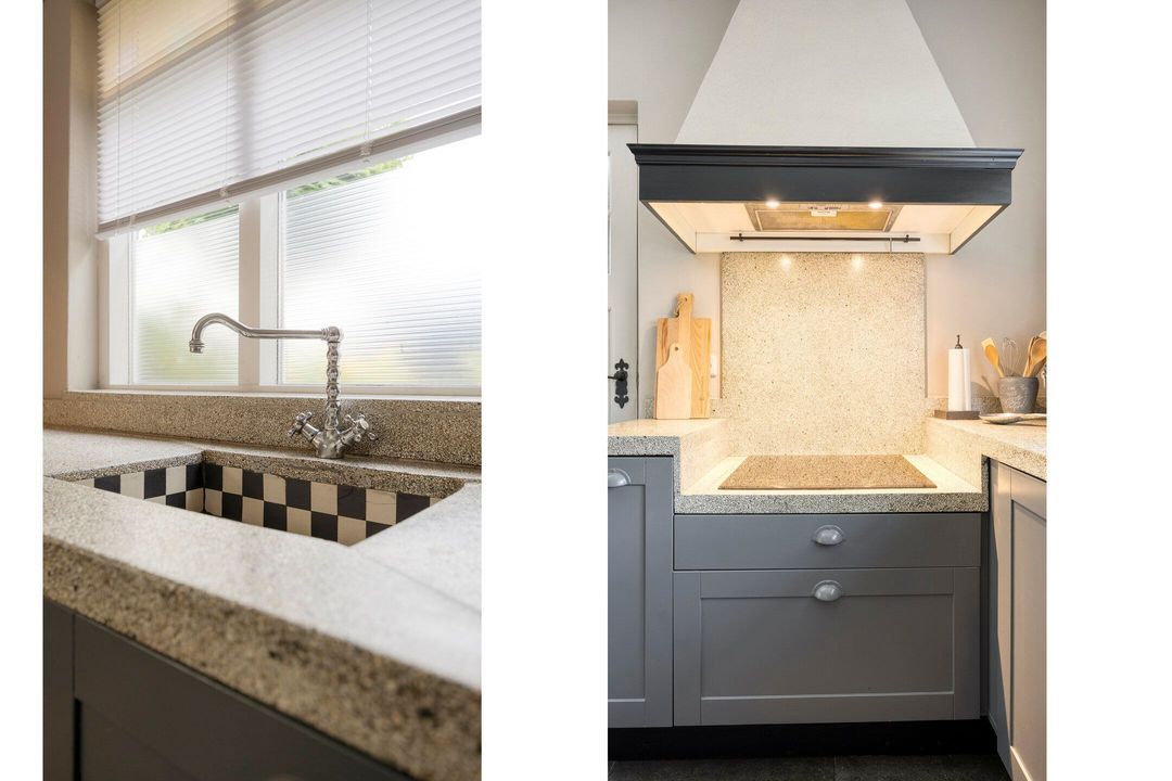 De eetkeuken heeft een keukeninrichting die in een ruime hoekopstelling is geplaatst en is voorzien van een zeer karakteristiek Terrazzo aanrechtblad (2023 geschuurd) compleet uitgerust met bijhorende, fraaie tegelspoelbak. Uiteraard voorzien van onder andere apparatuur, te weten een verlaagd kookgedeelte met inductie kookplaat (2024), een vaatwasser, afzuigkap en een koelkast. Vanuit de keuken heeft u een mooi uitzicht op de naastgelegen zijtuin en levendige straat maar ook een fijn uitzicht op de achtertuin. – Kortom een plek waar koken een plezier is.