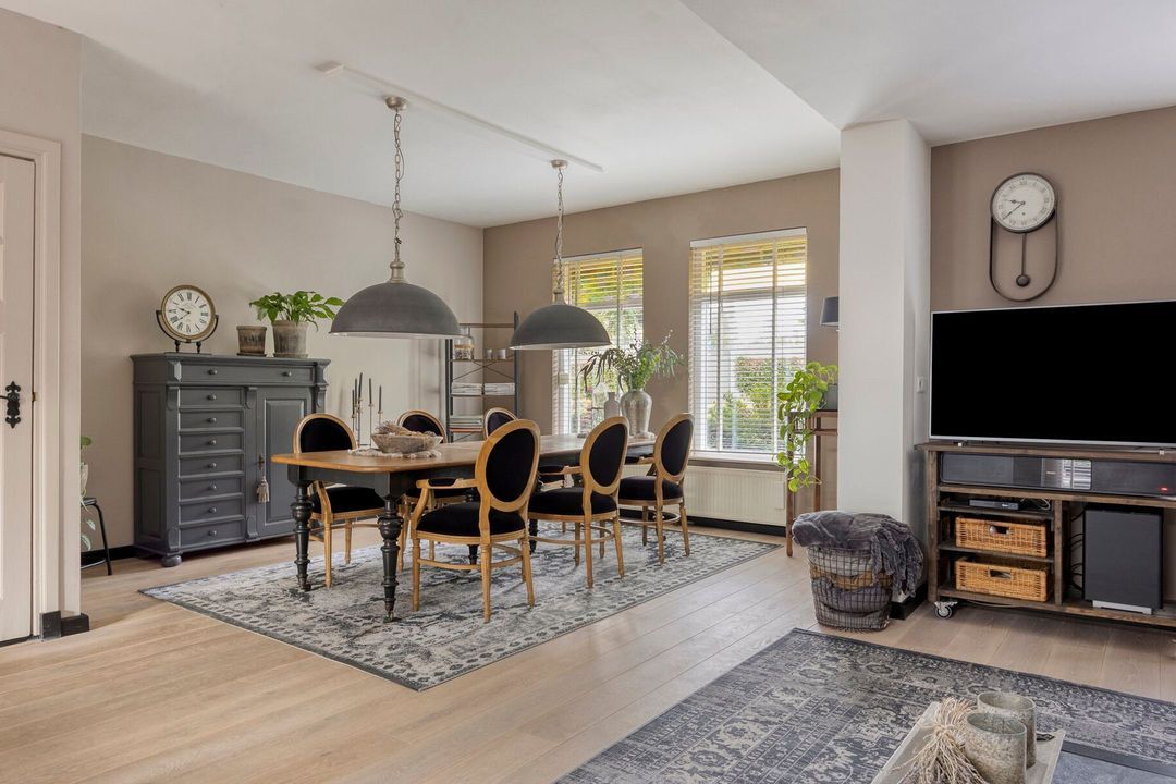 The spacious, extended living room offers a delightful living area filled with natural light thanks to large windows on both sides of the house. A beautiful solid wood floor, neutral walls, and a well-considered layout create a warm and inviting atmosphere. From the living room, you can enjoy an unobstructed view to the front, and through a door, you have direct access to the terrace and garden.