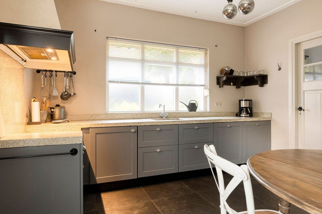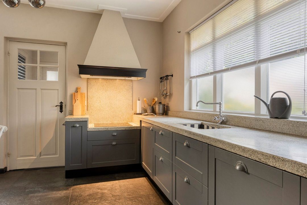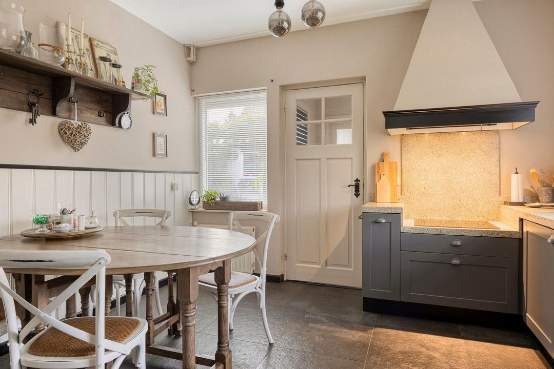 De eetkeuken heeft een keukeninrichting die in een ruime hoekopstelling is geplaatst en is voorzien van een zeer karakteristiek Terrazzo aanrechtblad (2023 geschuurd) compleet uitgerust met bijhorende, fraaie tegelspoelbak. Uiteraard voorzien van onder andere apparatuur, te weten een verlaagd kookgedeelte met inductie kookplaat (2024), een vaatwasser, afzuigkap en een koelkast. Vanuit de keuken heeft u een mooi uitzicht op de naastgelegen zijtuin en levendige straat maar ook een fijn uitzicht op de achtertuin. – Kortom een plek waar koken een plezier is.