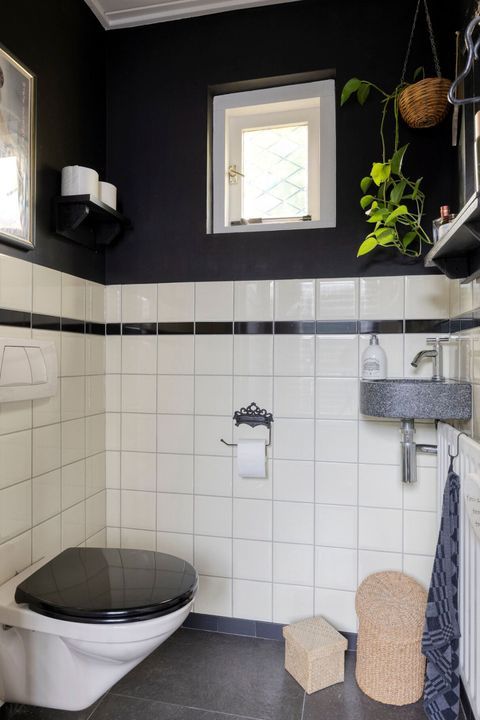 The contemporary bathroom includes a bathtub, shower cabin, washbasin with storage cabinet, and a wall-mounted toilet with concealed cistern. A new Velux roof window provides ample daylight and natural ventilation, in addition to the existing mechanical ventilation system.