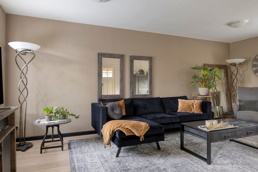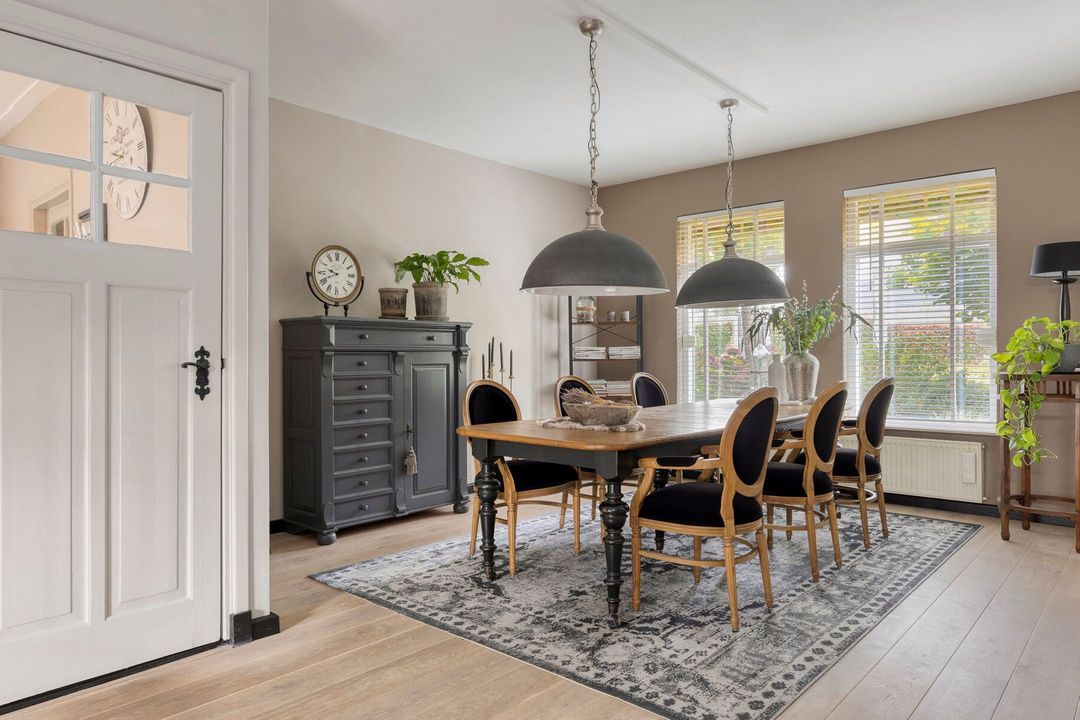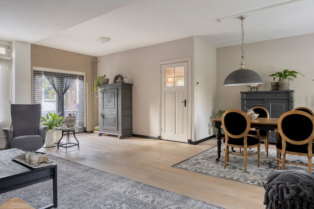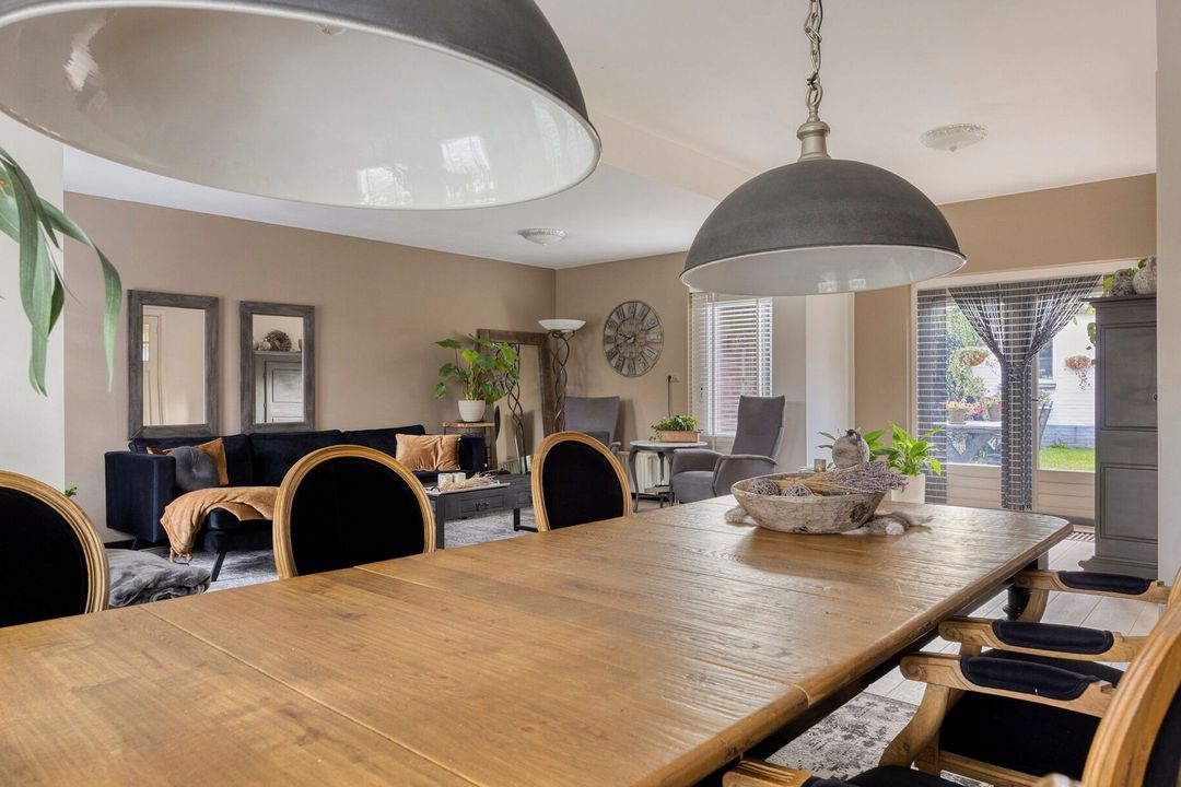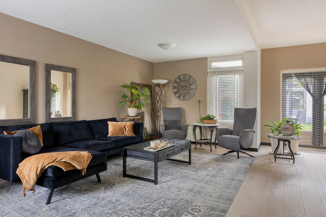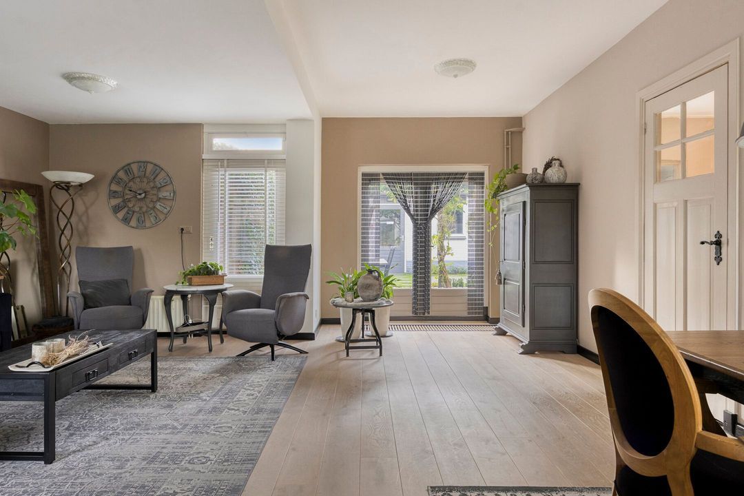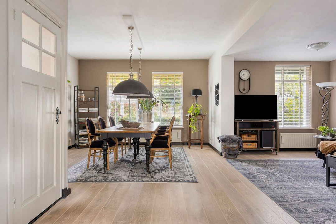 The spacious, extended living room offers a delightful living area filled with natural light thanks to large windows on both sides of the house. A beautiful solid wood floor, neutral walls, and a well-considered layout create a warm and inviting atmosphere. From the living room, you can enjoy an unobstructed view to the front, and through a door, you have direct access to the terrace and garden.