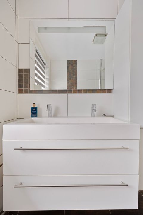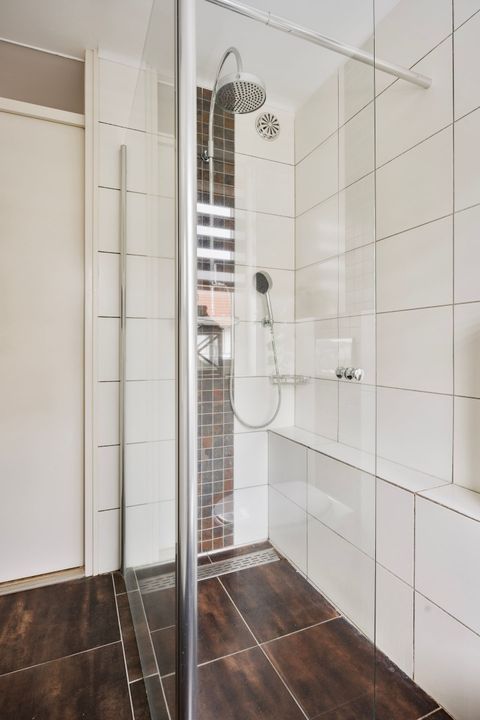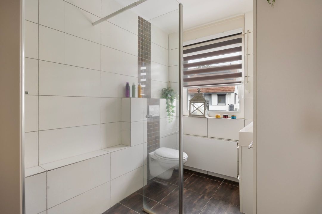 De moderne badkamer is geheel betegeld en ingericht met een ruime inloopdouche ruimte met plateau, een wandcloset met ingebouwd reservoir en een praktische vaste wastafelmeubel met twee kranen en fijne opbergruimte in de opberglades. Het raam in de badkamer zorgt voor prettig daglicht en extra ventilatiemogelijkheden.