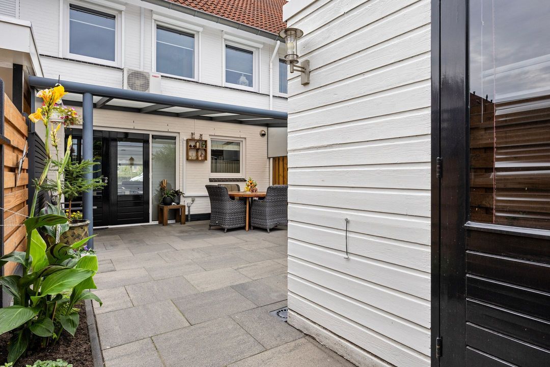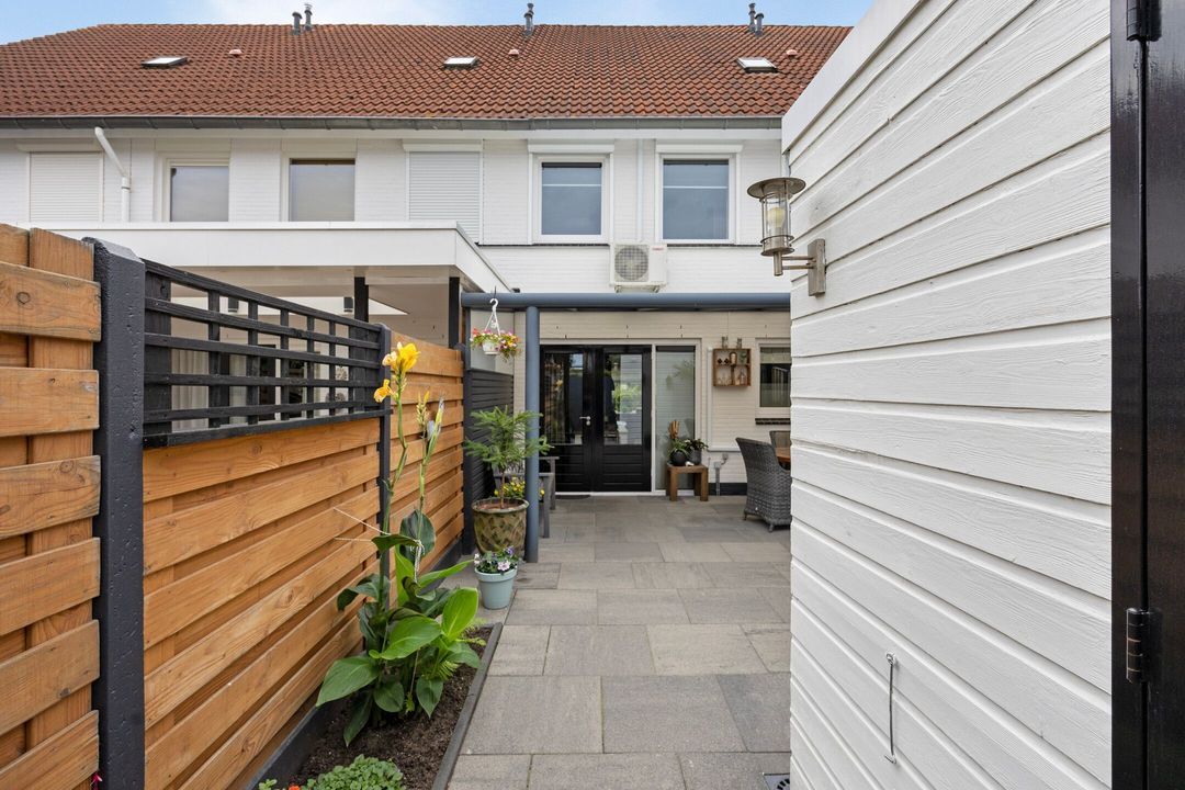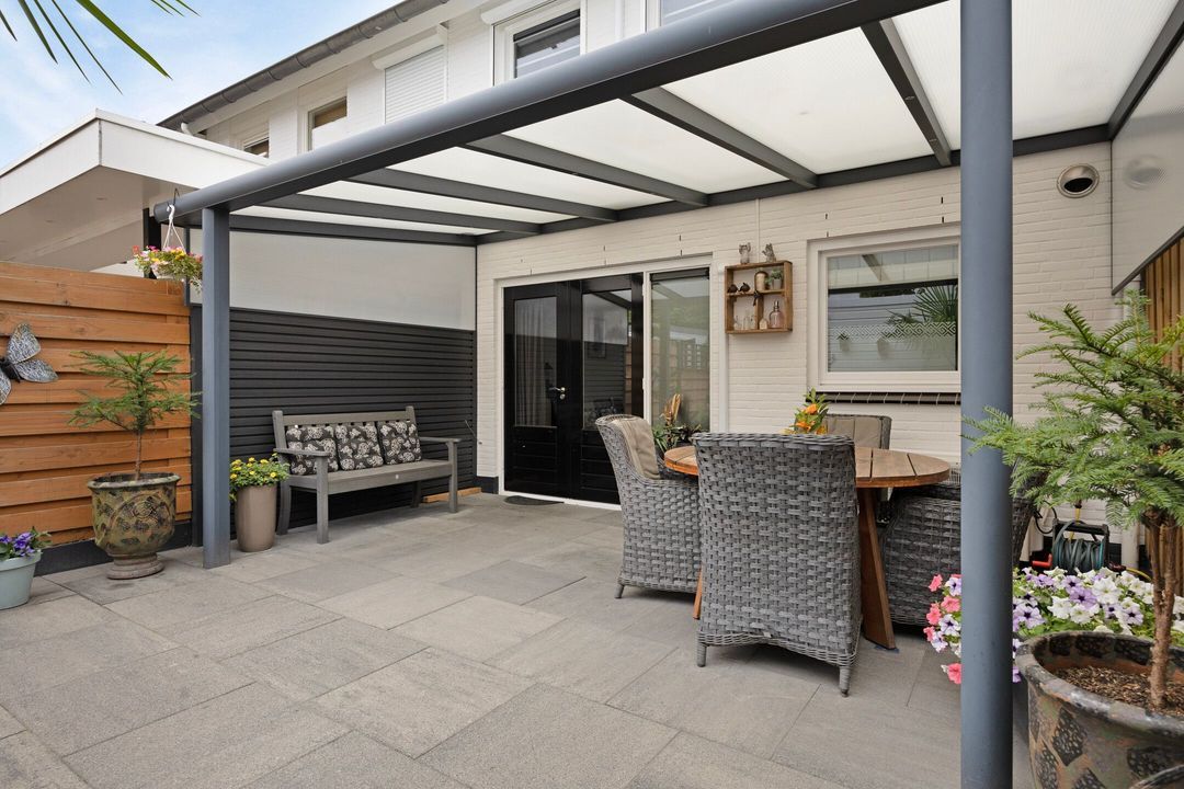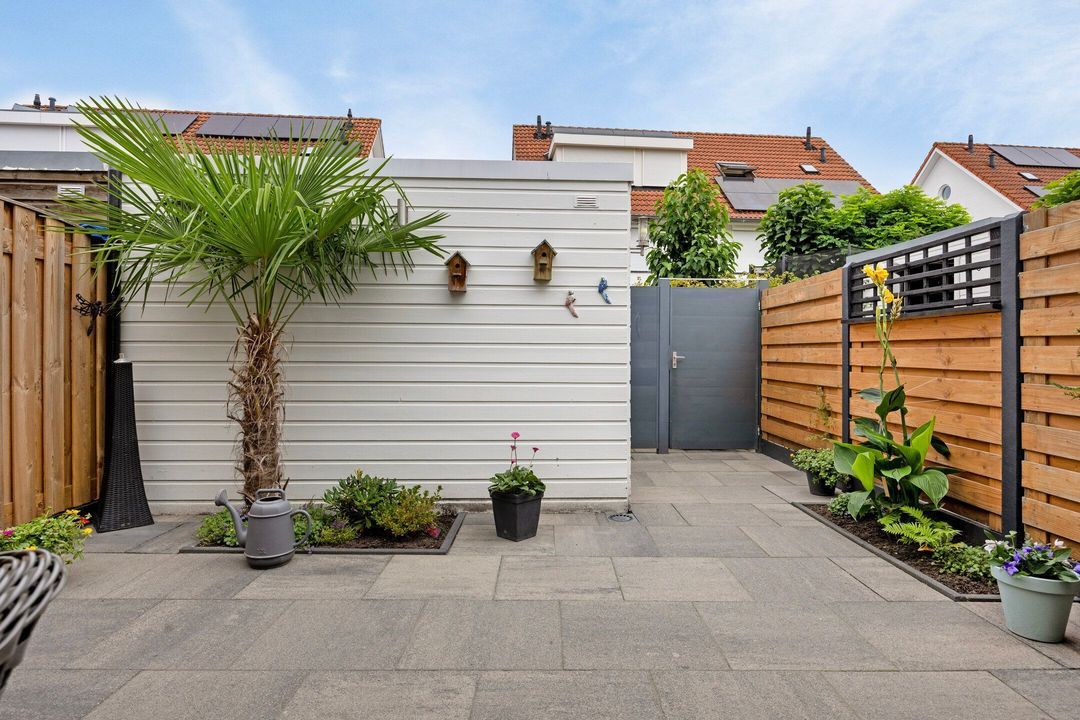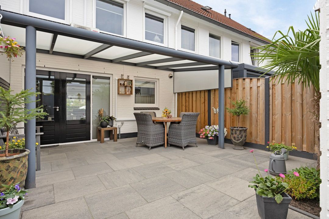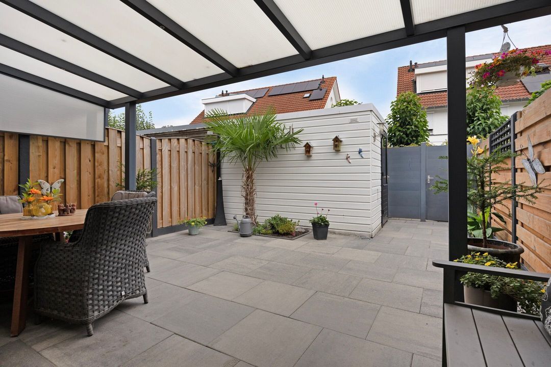 De onderhoudsvriendelijke en keurig aangelegde, goed onderhouden achtertuin biedt veel privacy en is voorzien van een luxe aluminium terrasoverkapping met fraaie inbouwverlichting. Voorts zijn er fraaie borders met beplanting en is er een groot zonneterras aanwezig. Achter in de tuin treft u een houten tuinhuis dat extra opslagmogelijkheden biedt. De vrije achterom zorgt voor extra gemak om met de fiets of afvalcontainers naar de voorzijde van de straat te komen.