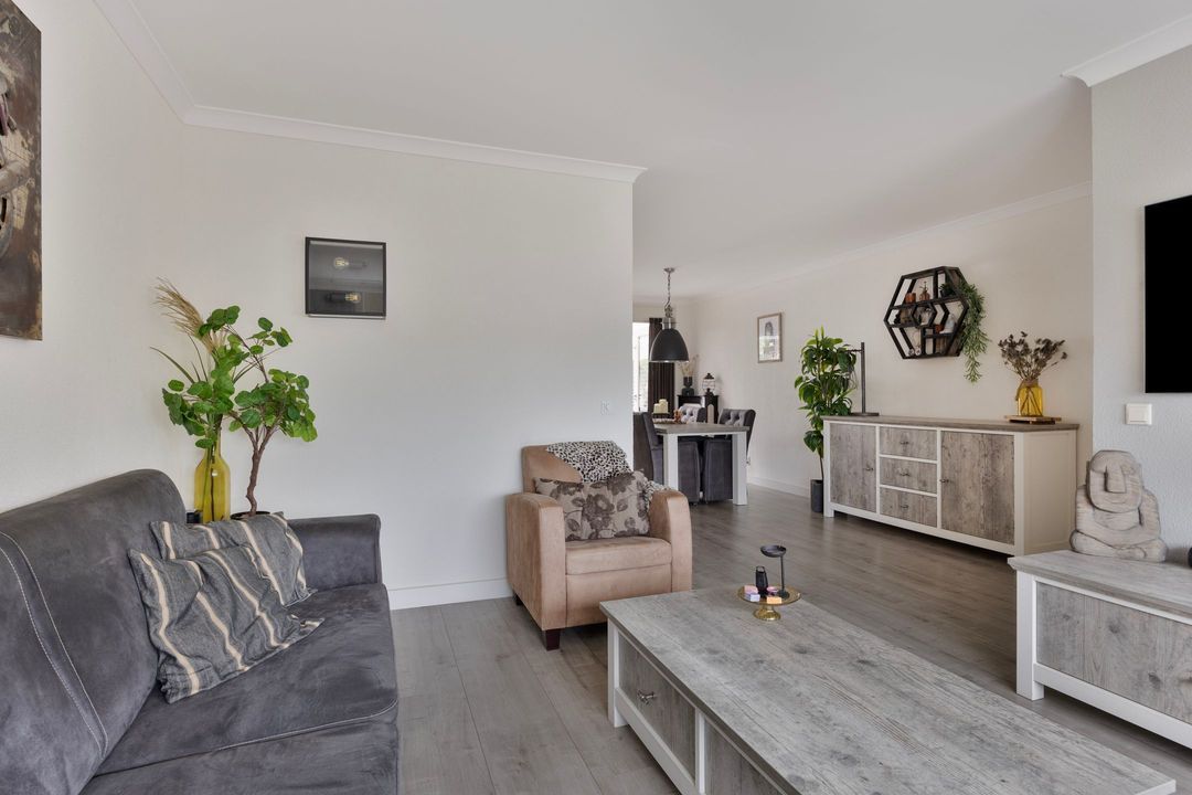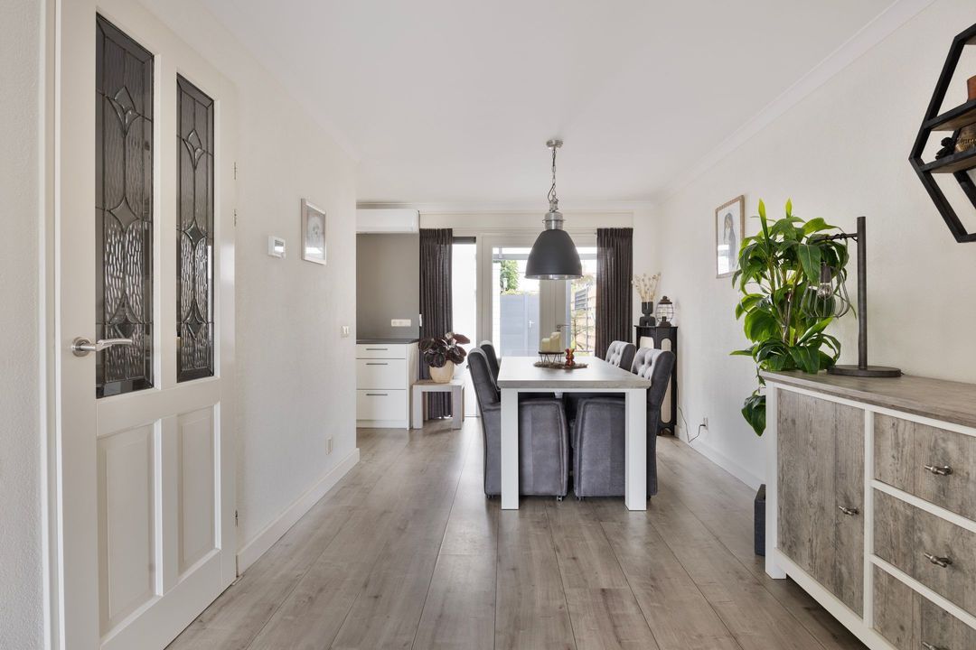 Vanuit de hal bereikt u de woonkamer die veel lichtinval geniet door de grote glaspartijen aan de voor- en achterzijde van de woning. Vanuit het zitgedeelte heeft u een prachtig en vrij uitzicht aan de voorzijde over de levendige straat en over het grote speelplantsoen.